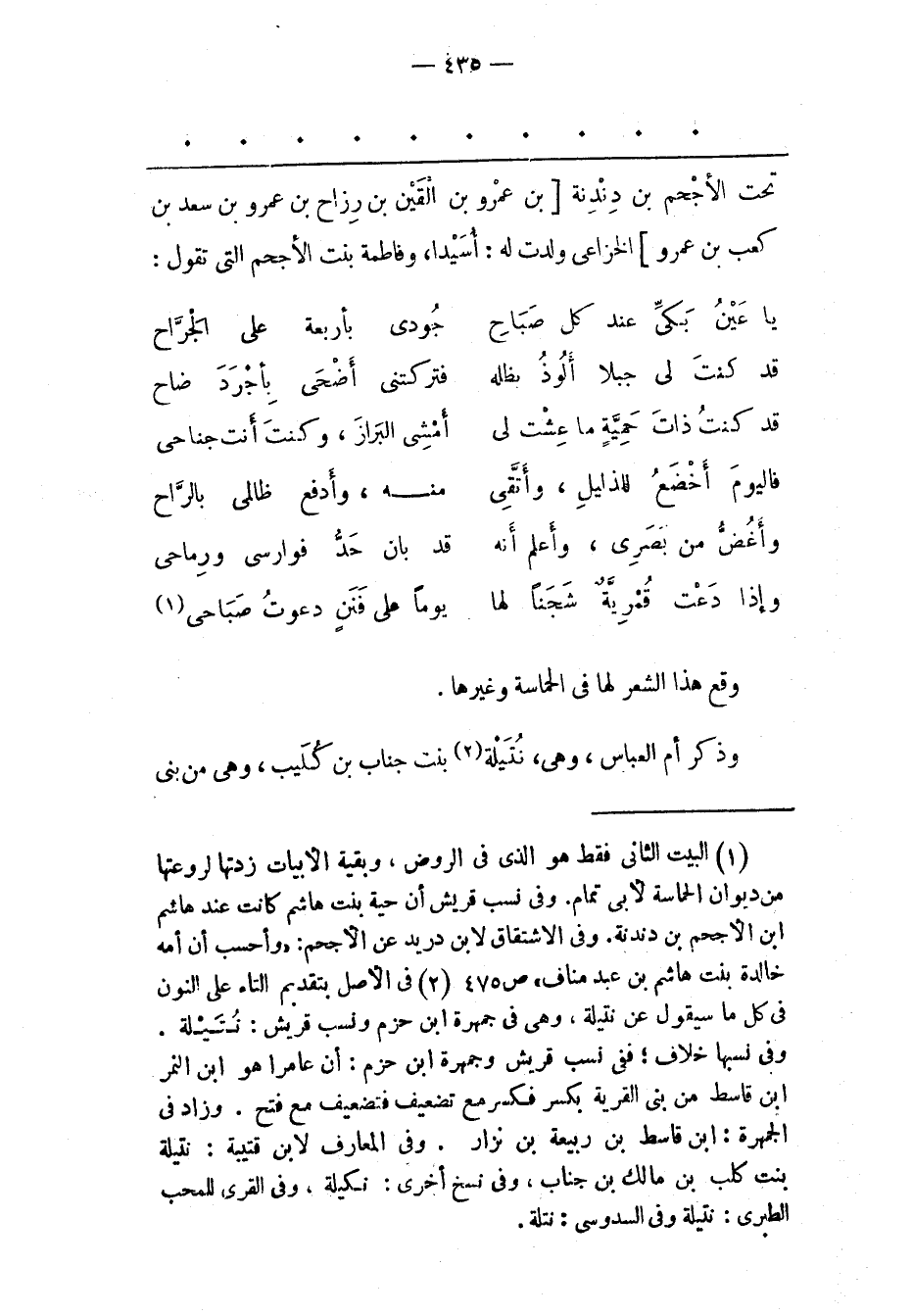 (1) البيت الثانى فقط هو الذى فى الروض، وبقية الأبيات زدتها لروعتها من ديوان الحماسة لأبى تمام. وفى نسب قريش أن حية بنت هاشم كانت عند هاشم ابن الأجحم بن دندنة. وفى الاشتقاق لابن دريد عن الأجحم: «وأحسب أن أمه خالدة بنت هاشم بن عبد مناف» ص 475