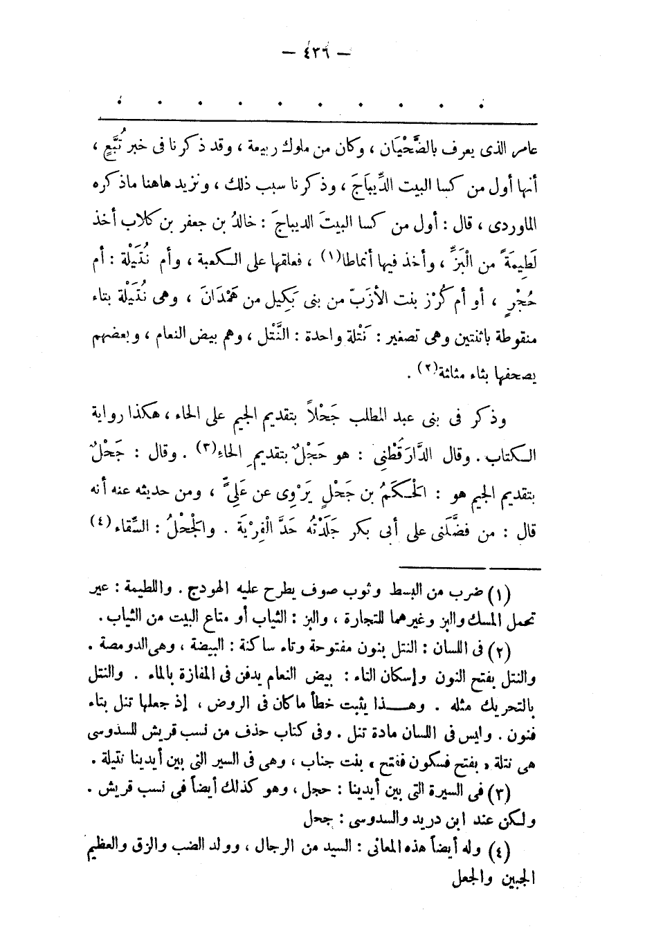 (3) فى السيرة التى بين أيدينا: حجل، وهو كذلك أيضا فى نسب قريش. ولكن عند ابن دريد والسدوسى: جحل
