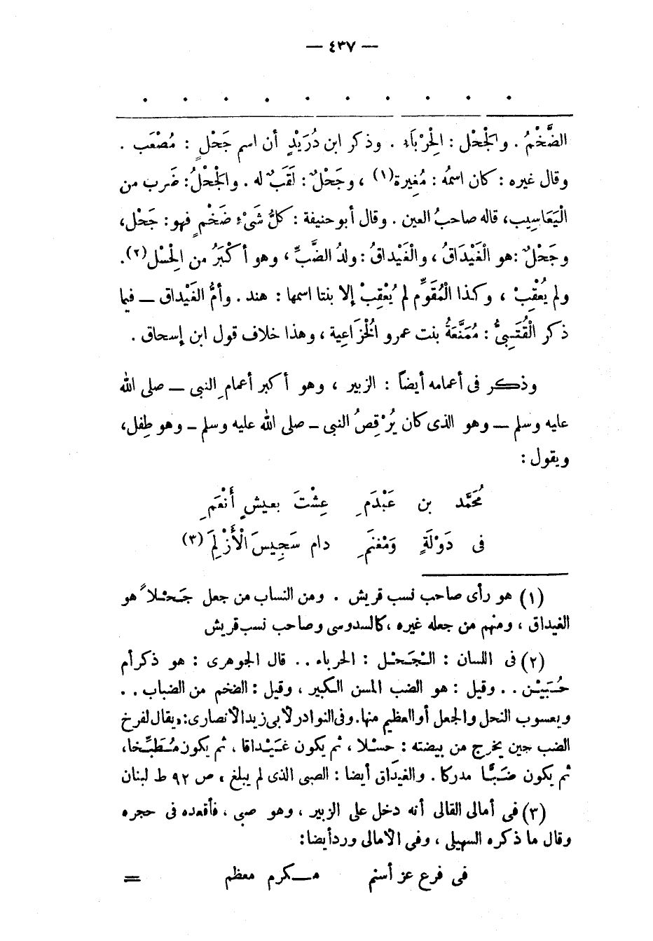 (1) هو رأى صاحب نسب قريش. ومن النساب من جعل جحلا هو الغيداق، ومنهم من جعله غيره، كالسدوسى وصاحب نسب قريش