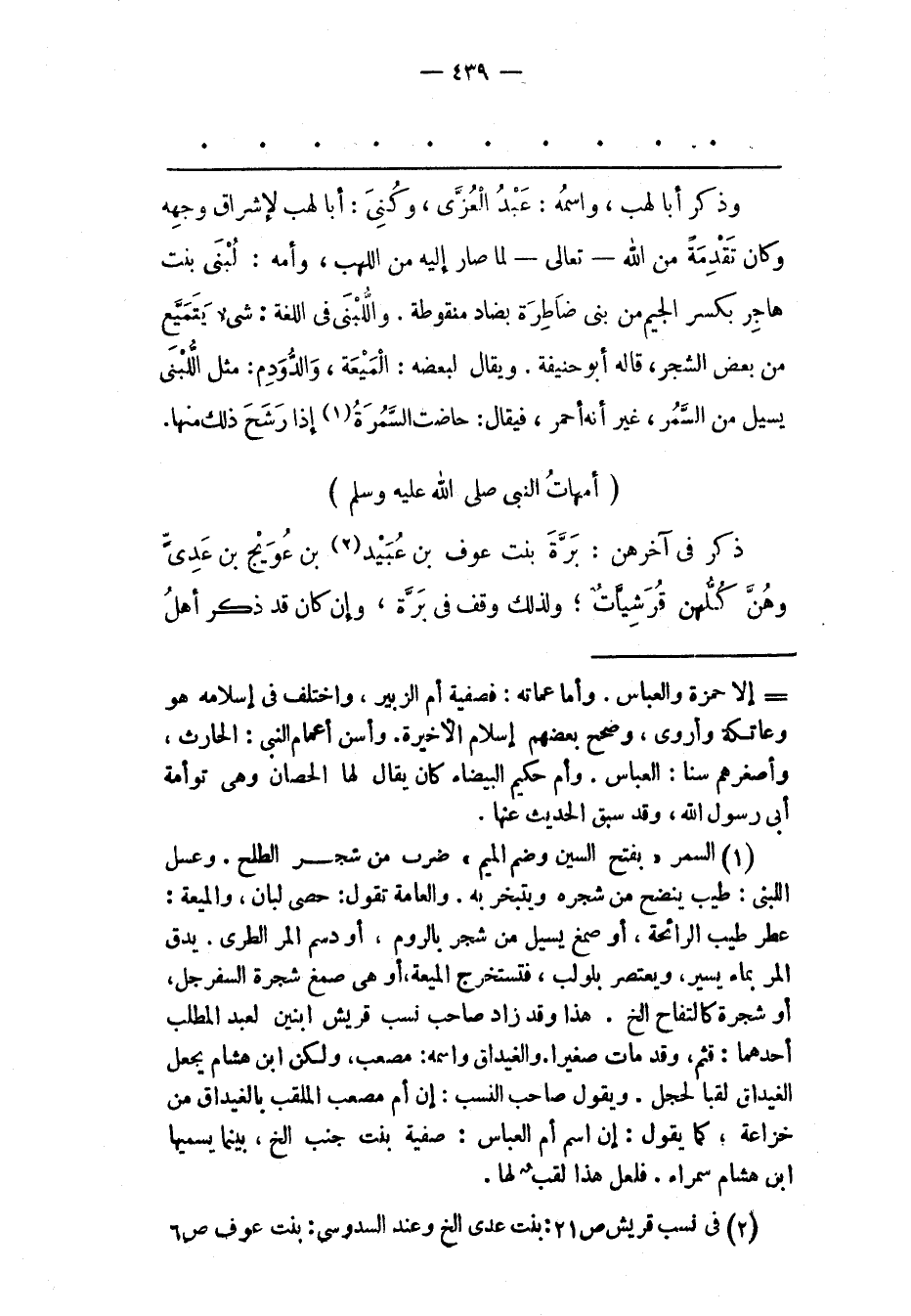 (1) السمر «بفتح السين وضم الميم» ضرب من شجر الطلح. وعسل اللبنى: طيب ينضح من شجره ويتبخر به. والعامة تقول: حصى لبان، والميعة: عطر طيب الرائحة، أو صمغ يسيل من شجر بالروم، أو دسم المر الطرى. يدق المر بماء يسير، ويعتصر بلولب، فتستخرج الميعة، أو هى صمغ شجرة السفرجل، أو شجرة كالتفاح الخ. هذا وقد زاد صاحب نسب قريش ابنين لعبد المطلب أحدهما: قثم، وقد مات صغيرا. والغيداق واسمه: مصعب، ولكن ابن هشام يجعل الغيداق لقبا لحجل. ويقول صاحب النسب: إن أم مصعب الملقب بالغيداق من خزاعة، كما يقول: إن اسم أم العباس: صفية بنت جنب الخ، بينما يسميها ابن هشام سمراء. فاعل هذا لقب لها.
