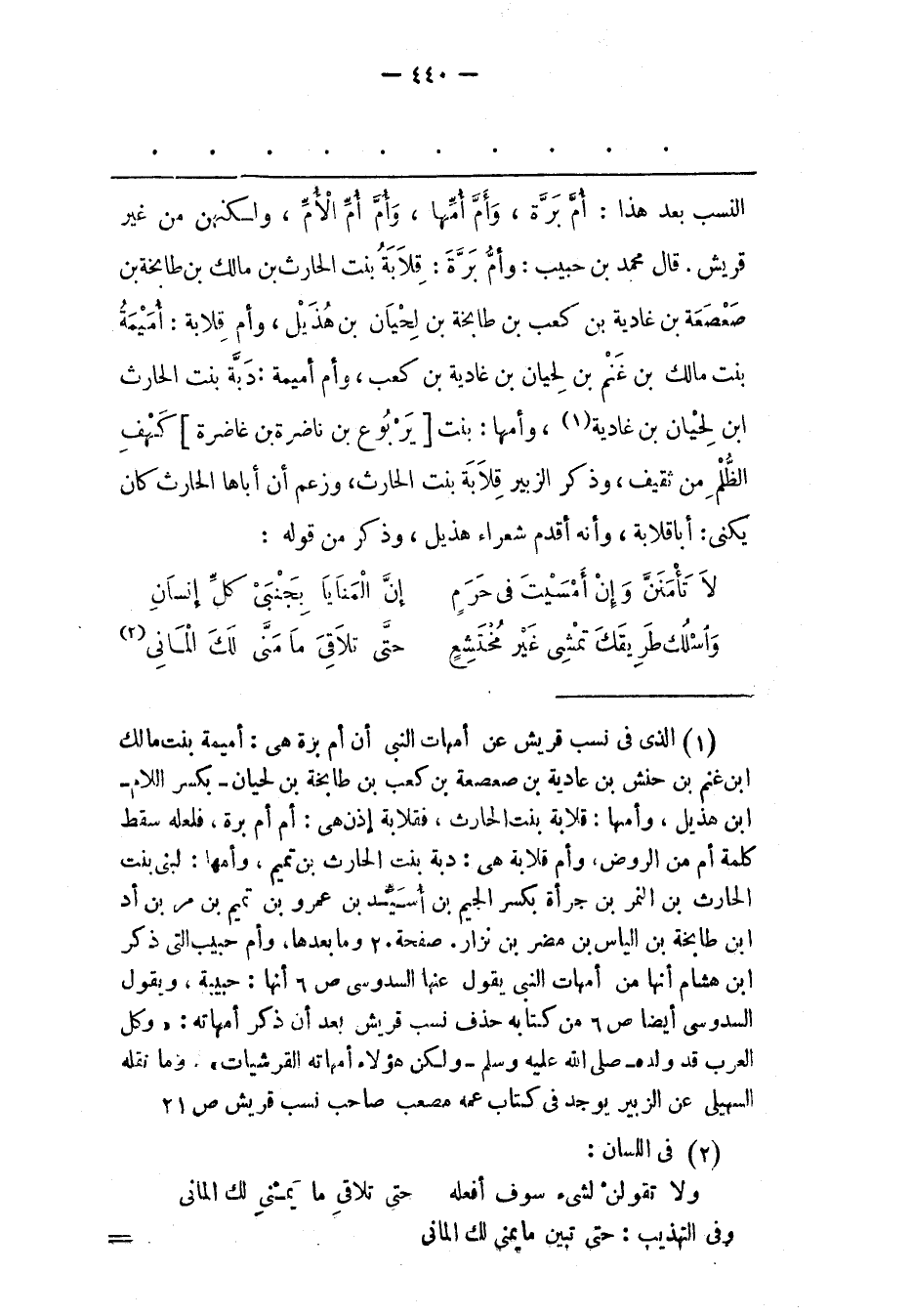 النّسَبِ بَعْدَ هَذَا: أُمّ بَرّةَ، وَأُمّ أُمّهَا، وَأُمّ أُمّ الْأُمّ، وَلَكِنّهُنّ مِنْ غَيْرِ قُرَيْشٍ. قَالَ مُحَمّدُ بْنُ حَبِيبٍ: وَأُمّ بَرّةَ: قِلَابَةُ بِنْتُ الْحَارِثِ بْنِ مَالِكُ بْنُ طَابِخَةَ بْنِ صَعْصَعَةَ بْنِ غَادِيَةَ بْنِ كَعْبِ بْنِ طَابِخَةَ بْنِ لِحْيَانَ بْنِ هُذَيْلٍ، وَأُمّ قِلَابَةَ: أُمَيْمَةُ بِنْتُ مَالِكِ بْنِ غَنْمِ بْنِ لِحْيَانَ بْنِ غَادِيَةَ بْنِ كَعْبٍ، وَأُمّ أُمَيْمَةَ: دَبّةُ بِنْتُ الحارث ابن لِحْيَانَ بْنِ غَادِيَةَ «1» ، وَأُمّهَا: بِنْتُ [يَرْبُوعِ بْنِ نَاضِرَةَ بْنِ غَاضِرَةَ] كَهْفِ الظّلْمِ مِنْ ثَقِيفٍ، وَذَكَرَ الزّبَيْرُ قَلَابَةَ بِنْتَ الْحَارِثِ، وَزَعَمَ أَنّ أَبَاهَا الْحَارِثَ كَانَ يُكَنّى: أَبَا قَلَابَةَ، وَأَنّهُ أَقْدَمُ شُعَرَاءِ هُذَيْلٍ، وَذَكَرَ مِنْ قَوْلِهِ: