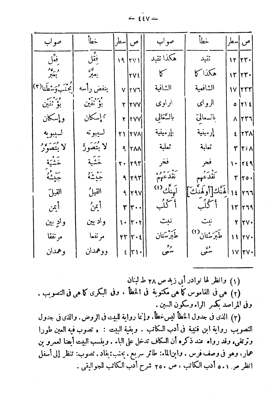 (3) الذى فى جدول الخطأ ليس خطأ، وإنما رواية للبيت فى الروض. والذى فى جدول التصويب رواية ابن قتيبة فى أدب الكاتب. وبقية البيت: «تصوب فيه العين طورا وترتقى» وقد رواه عند ذكره أن الكاف تدخل على الباء. وينسب البيت أيضا لعمرو بن عمار، وهو فى وصف فرس. وابن الماء: طائر سريع. يجنب: يقاد. تصوب: تنظر إلى أسفل انظر ص 501 أدب الكاتب، ص 250 شرح أدب الكاتب للجواليقى.