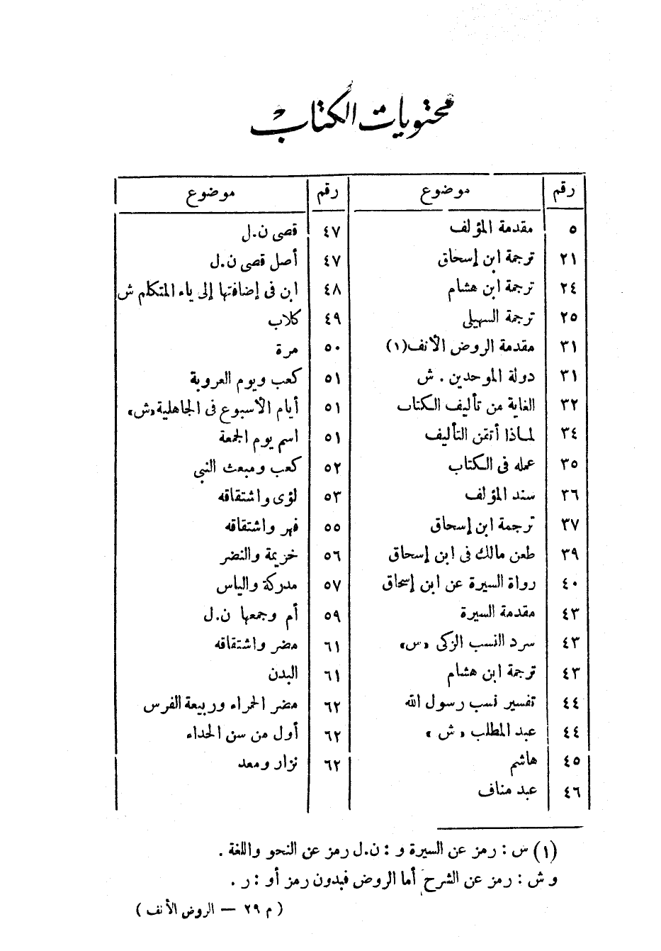 (1) س: رمز عن السيرة و: ن. ل رمز عن النحو واللغة. وش: رمز عن الشرح أما الروض فبدون رمز أو: ر.