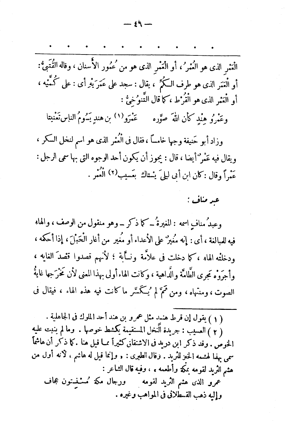 (2) العسيب: جريدة النخل المستقيمة يكشط خوصها. وما لم ينبت عليه الخوص. وقد ذكر ابن دريد فى الاشتقاق كثيرا مما قيل هنا. كما ذكر أن هاشما سمى بهذا لهشمه الخبز للثريد. وقال الطبرى: «وإنما قيل له هاشم، لأنه أول من هشم الثريد لقومه بمكة وأطعمه» ، وفيه قال الشاعر: