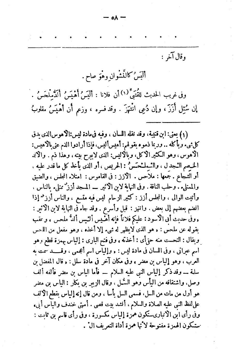 (1) يعنى: ابن قتيبة، وقد نقله اللسان، وفيه فى مادة ليس: الأهوس الذى يدق كل شئ ويأكله.. وربما ذموه بقولهم: أهيس أليس، فإذا أرادوا الذم عنى بالأهيس: الأهوس، وهو الكثير الأكل، وبالأليس: الذى لا يبرح بيته، وهذا ذم. والألد الخصم الجدل، والملحس: الحريص، أو الذى يأخذ كل ما قدر عليه، أو الشجاع. جمعها: ملاحس. الأزز: فى القاموس: امتلاء المجلس، والضيق والممتلئ. وحلب الناقة. وفى النهاية لابن الأثير- المسجد أزز ممتلئ بالناس، وأتيت الوالى، والمجلس أزز: كثير الزحام ليس فيه متسع، والناس أزز إذا انضم بعضهم إلى بعض. وانتهز: قبل وأسرع. وقد جاء فى النهاية لابن الأثير: «وفى حديث أبى الأسود: عليكم فلانا فإنه أهيس أليس ألدّ ملحس» وعقب بقوله عن ملحس: «هو الذى لا يظهر له شئ إلا أخذه، وهو مفعل من اللحس ويقال: التحست منه حقى أى: أخذته» وفى فتح البارى: إلياس بهمزة قطع وهو اسم عبرانى، وفى اللسان فى مادة ليس: «وإلياس اسم أعجمى، وقد سمت به العرب، وهو إلياس بن مضر» وفى مكان آخر فى مادة سلل: «قال المفضل بن سلمة- وقد ذكر إلياس النبى عليه السلام- فأما الياس بن مضر فألفه ألف وصل، واشتقاقه من اليأس وهو السّل، وقال الزبير بن بكار: الياس بن مضر هو أول من مات من السل، فسمى السل يأسا، ومن قال إنه إلياس بقطع الألف على لفظ النبى عليه الصلاة والسلام، أنشد بيت قصى: أمهتى خندف والياس أبى» وفى رأى ابن الأنبارى ستكون همزة إلياس مكسورة، وفى رأى قاسم بن ثابت: ستكون الهمزة مفتوحة لأنها همزة أداة التعريف ال.