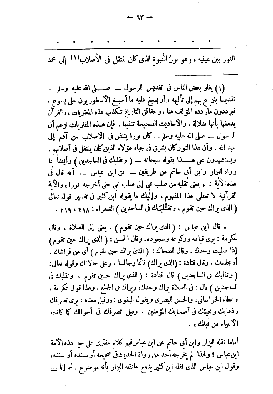 (1) يغلو بعض الناس فى تقديس الرسول- صلى الله عليه وسلم- تقديسا ينزع بهم إلى تأليهه، أو يسبغ عليه ما أسبغ الأسطوريون على يسوع، فيرددون ماردده المؤلف هنا، وحقائق التاريخ تكذب هذه المفتريات، والقرآن يدمغها بأنها ضلالة، والأحاديث الصحيحة تنفيها. فإن هذه المفتريات تزعم أن الرسول- صلى الله عليه وسلم- كان نورا يتنقل فى الأصلاب من آدم إلى عبد الله، وأن هذا النور كان يشرق فى جباه هؤلاء الذين كان ينتقل فى أصلابهم. ويستشهدون على هذا بقوله سبحانه- (وَتَقَلُّبَكَ فِي السَّاجِدِينَ) وأيضا بما رواه البزار وابن أبى حاتم من طريقين- عن ابن عباس- أنه قال فى هذه الآية: «يعنى تقلبه من صلب نبى إلى صلب نبى حتى أخرجه نورا» والآية القرآنية لا تعطى هذا المفهوم، وإليك ما يقوله ابن كثير فى تفسير قوله تعالى (الَّذِي يَراكَ حِينَ تَقُومُ، وَتَقَلُّبَكَ فِي السَّاجِدِينَ) الشعراء: 218، 219. «قال ابن عباس: (الذى يراك حين تقوم) . يعنى إلى الصلاة، وقال عكرمة: يرى قيامه وركوعه وسجوده. وقال الحسن: (الذى يراك حين تقوم) إذا صليت وحدك، وقال الضحاك: (الذى يراك حين تقوم) أى من فراشك، أو مجلسك، وقال قتادة: (الذى يراك) قائما وجالسا، وعلى حالاتك وقوله تعالى: (وتقلبك فى الساجدين) قال قتادة: (الذى يراك حين تقوم، وتقلبك فى الساجدين) قال: فى الصلاة يراك وحدك، ويراك فى الجمع، وهذا قول عكرمة، وعطاء الخراسانى، والحسن البصرى ويقول البغوى: «وقيل معناه: يرى تصرفك وذهابك ومجيئك فى أصحابك المؤمنين، وقيل تصرفك فى أحوالك كما كانت الأنبياء من قبلك» . أماما نقله البزار وابن أبى حاتم عن ابن عباس فهو كلام مفترى على حبر هذه الأمة ابن عباس؛ ولهذا لم يخرجه أحد من رواة الحديث فى صحيحه أو مسنده أو سننه، وقول ابن عباس الذى نقله ابن كثير يدمغ ما نقله البزار بأنه موضوع. ثم إنا-