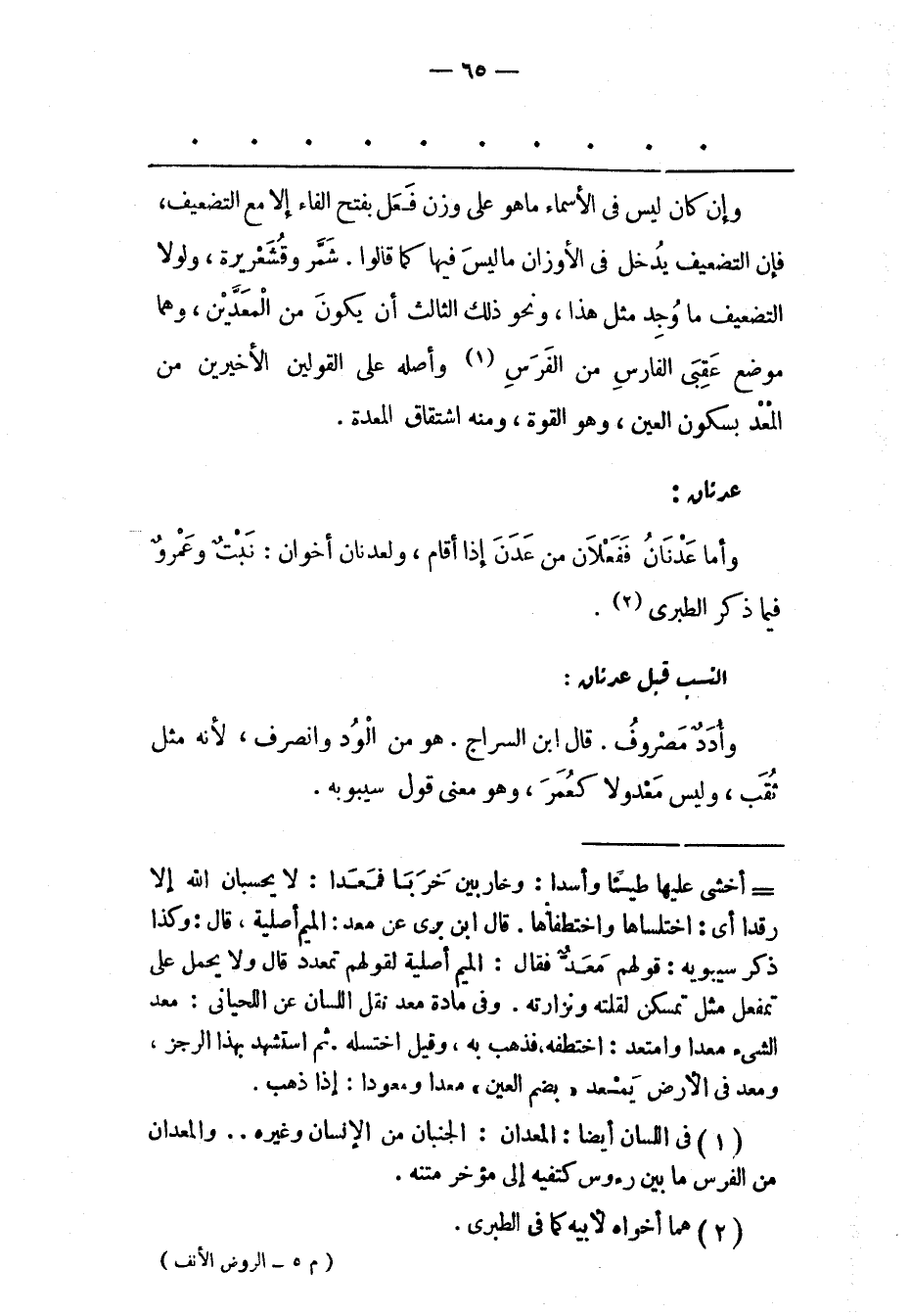 وَإِنْ كَانَ لَيْسَ فِي الْأَسْمَاءِ مَا هُوَ عَلَى وَزْنِ فَعَلٍ بِفَتْحِ الْفَاءِ إلّا مَعَ التّضْعِيفِ، فَإِنّ التّضْعِيفَ يُدْخِلُ فِي الْأَوْزَانِ مَا لَيْسَ فِيهَا كَمَا قَالُوا. شَمّرَ وَقُشَعْرِيرَةَ، وَلَوْلَا التّضْعِيفُ مَا وُجِدَ مِثْلُ هَذَا، وَنَحْوُ ذَلِكَ الثّالِثِ أَنْ يَكُونَ مِنْ الْمَعَدّيْنِ، وَهُمَا مَوْضِعُ عَقِبَيْ الْفَارِسِ مِنْ الْفَرَسِ «1» وَأَصْلُهُ عَلَى الْقَوْلَيْنِ الْأَخِيرَيْنِ مِنْ الْمَعْدِ بِسُكُونِ الْعَيْنِ، وَهُوَ الْقُوّةُ، وَمِنْهُ اشْتِقَاقُ الْمَعِدَةِ.