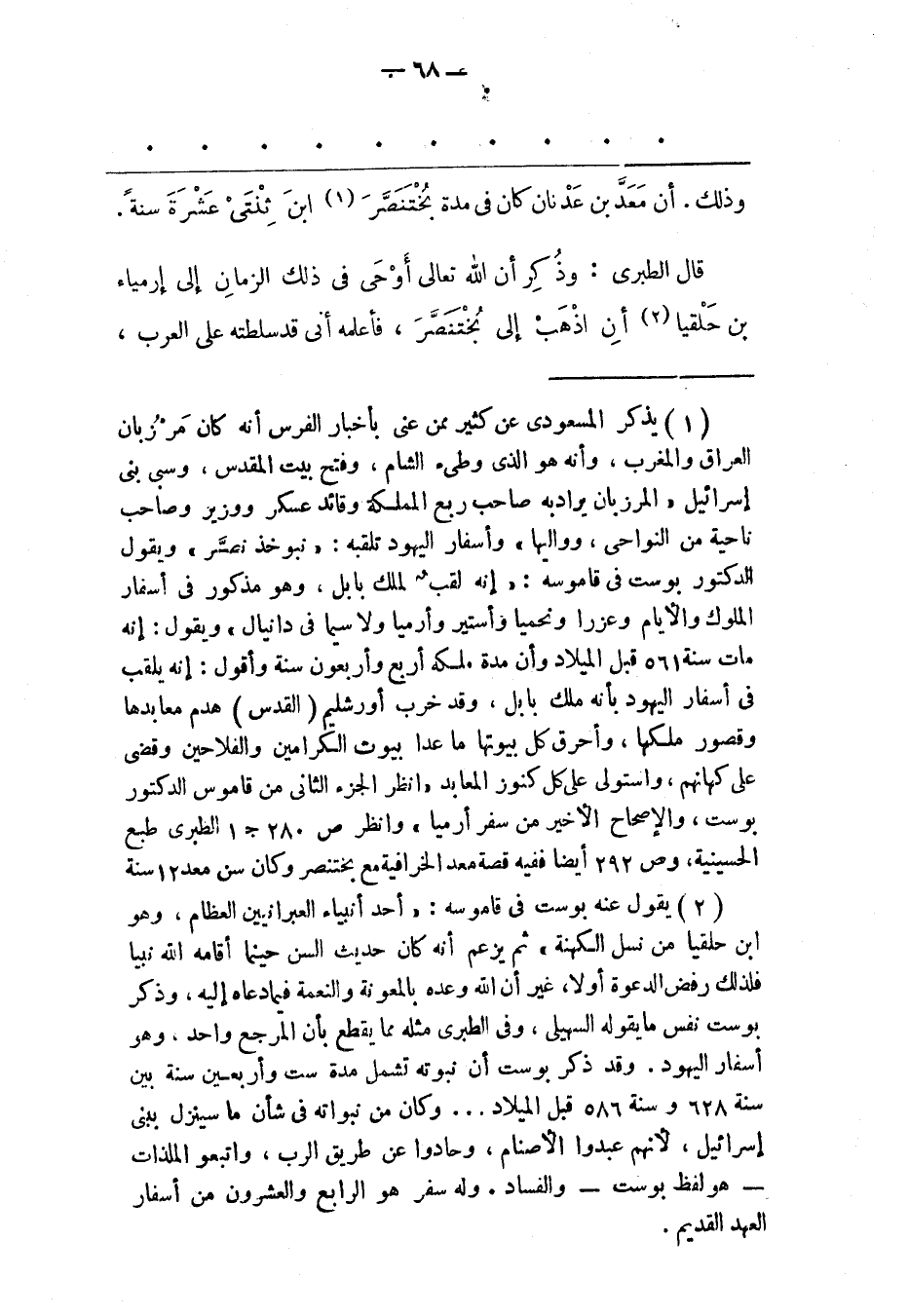 (1) يذكر المسعودى عن كثير ممن عنى بأخبار الفرس أنه كان مرزبان العراق والمغرب، وأنه هو الذى وطئ الشام، وفتح بيت المقدس، وسبى بنى إسرائيل «المرزبان يراد به صاحب ربع المملكة وقائد عسكر ووزير وصاحب ناحية من النواحى، وواليها» وأسفار اليهود تلقبه: «نبوخذ نصّر» ويقول الدكتور بوست فى قاموسه: «إنه لقب لملك بابل، وهو مذكور فى أسفار الملوك والأيام وعزرا ونحميا وأستير وأرميا ولا سيما فى دانيال» ويقول: إنه مات سنة 561 قبل الميلاد وأن مدة ملكه أربع وأربعون سنة وأقول: إنه يلقب فى أسفار اليهود بأنه ملك بابل، وقد خرب أورشليم (القدس) هدم معابدها وقصور ملكها، وأحرق كل بيوتها ما عدا بيوت الكرامين والفلاحين وقضى على كهانهم، واستولى على كل كنوز المعابد «انظر الجزء الثانى من قاموس الدكتور بوست، والإصحاح الأخير من سفر أرميا» وانظر ص 280 ج 1 الطبرى طبع الحسينية، وص 292 أيضا ففيه قصة معد الخرافية مع بختنصر وكان سن معد 12 سنة