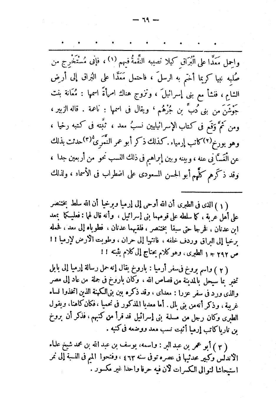 (1) الذى فى الطبرى أن الله أوحى إلى إرميا وبرخيا أن الله سلط بختنصر على أهل عربة، كما سلطه على قومهما بنى إسرائيل، وأنه قال لهما: فعليكما بمعد ابن عدنان، فخرجا حتى سبقا بختنصر، فلقيهما عدنان، فطوياه إلى معد، فحمله برخيا إلى البراق وردف خلفه، فانتهيا إلى حزان، وطويت الأرض لإرميا!! ص 292 ج 1 الطبرى، وهو كلام يحتاج إلى كلام يثبته!!