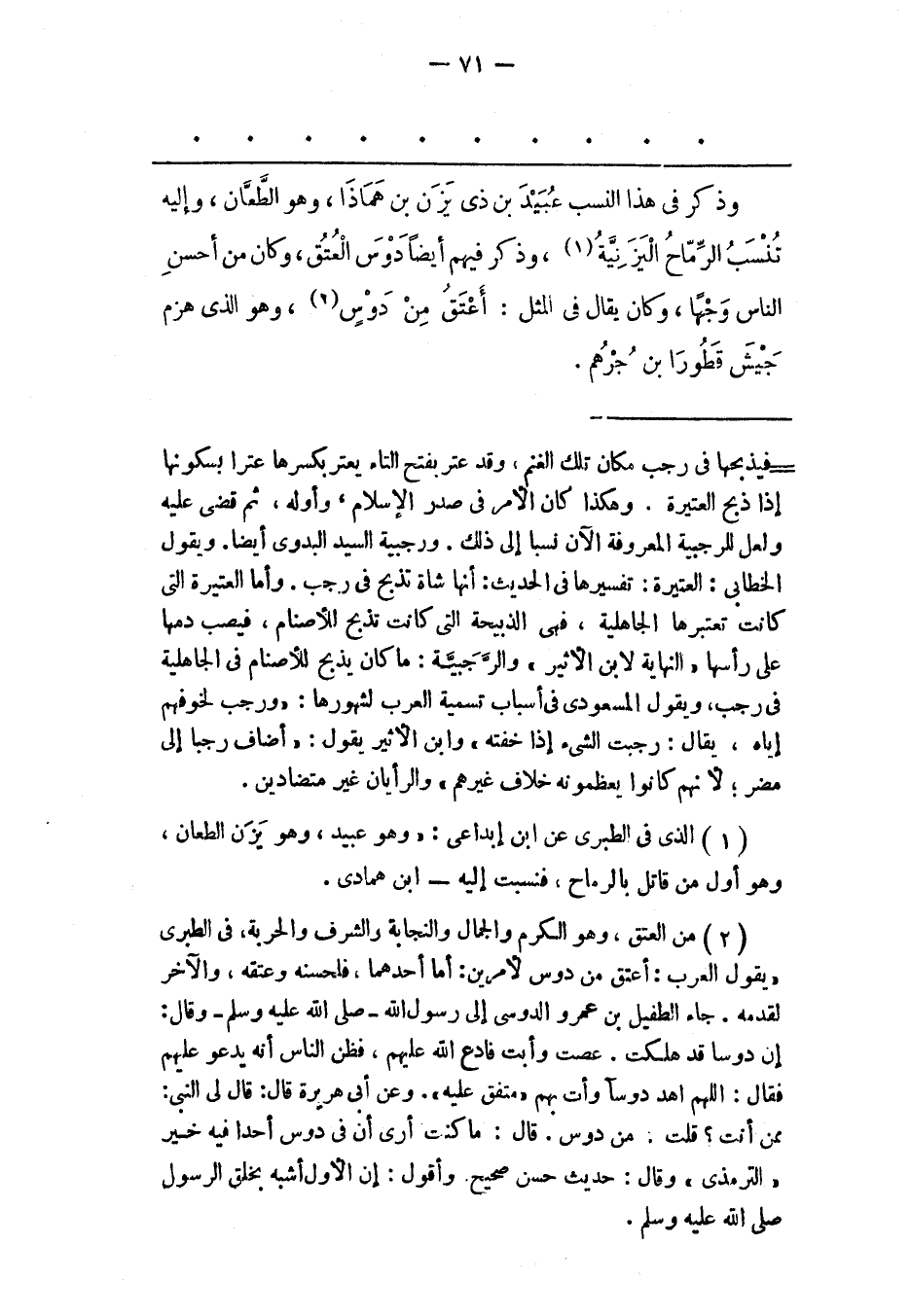 وَذَكَرَ فِي هَذَا النّسَبِ عُبَيْدَ بْنَ ذِي يَزَنَ بْنِ هَمَاذَا، وَهُوَ الطّعّانُ، وَإِلَيْهِ تُنْسَبُ الرّمَاحُ الْيَزَنِيّةُ «1» ، وَذَكَرَ فِيهِمْ أَيْضًا دَوْسَ الْعُتُقَ، وَكَانَ مِنْ أَحْسَنِ النّاسِ وَجْهًا، وَكَانَ يُقَالُ فِي الْمَثَلِ: أَعْتَقُ مِنْ دَوْسٍ «2» ، وَهُوَ الّذِي هزم جيش قطورا بن جرهم.