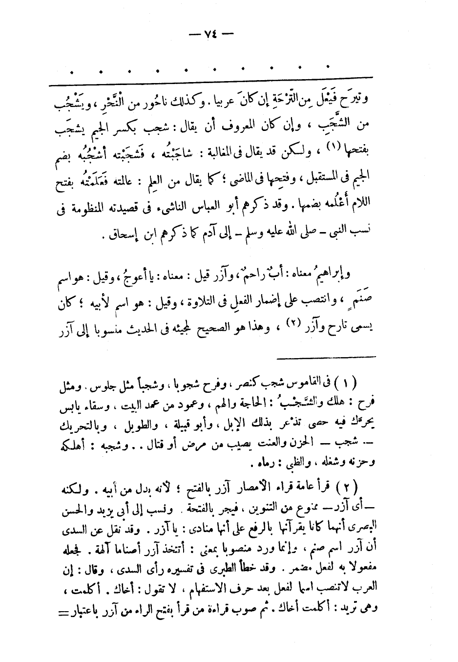 (2) قرأ عامة قراء الأمصار آزر بالفتح؛ لأنه بدل من أبيه. ولكنه- أى آزر- ممنوع من التنوين، فيجر بالفتحة. ونسب إلى أبى يزيد والحسن البصرى أنهما كانا يقرآنها بالرفع على أنها منادى: يا آزر. وقد نقل عن السدى أن آزر اسم صنم، وإنما ورد منصوبا بمعنى: أتتخذ آزر أصناما آلهة. فجعله مفعولا به لفعل مضمر. وقد خطأ الطبرى فى تفسيره رأى السدى، وقال: إن العرب لا تنصب اسما لفعل بعد حرف الاستفهام، لا تقول: أخاك. أكلمت، وهى تريد: أكلمت أخاك. ثم صوب قراءة من قرأ بفتح الراء من آزر باعتبار-