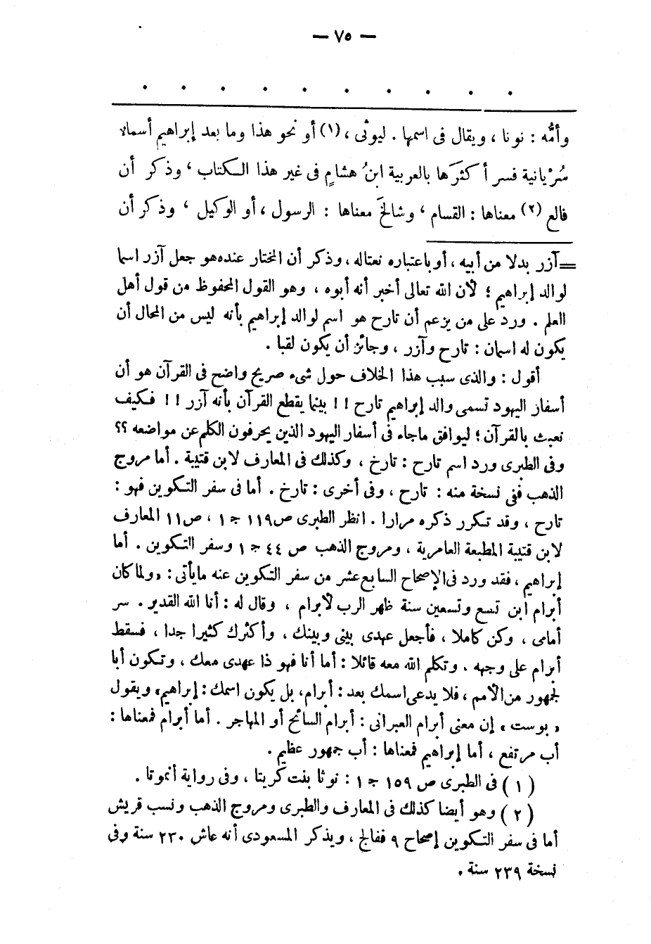 - آزر بدلا من أبيه، أو باعتباره نعتاله، وذكر أن المختار عنده هو جعل آزر اسما لوالد إبراهيم؛ لأن الله تعالى أخبر أنه أبوه، وهو القول المحفوظ من قول أهل العلم. ورد على من يزعم أن تارح هو اسم لوالد إبراهيم بأنه ليس من المحال أن يكون له اسمان: تارح وآزر، وجائز أن يكون لقبا. أقول: والذى سبب هذا الخلاف حول شئ صريح واضح فى القرآن هو أن أسفار اليهود تسمى والد إبراهيم تارح!! بينما يقطع القرآن بأنه آزر!! فكيف نعبث بالقرآن؛ ليوافق ما جاء فى أسفار اليهود الذين يحرفون الكلم عن مواضعه؟؟ وفى الطبرى ورد اسم تارح: تارخ، وكذلك فى المعارف لابن قتيبة. أما مروج الذهب ففى نسخة منه: تارح، وفى أخرى: تارخ. أما فى سفر التكوين فهو: تارح، وقد تكرر ذكره مرارا. انظر الطبرى ص 119 ج 1، ص 11 المعارف لابن قتيبة المطبعة العامرية، ومروج الذهب ص 44 ج 1 وسفر التكوين. أما إبراهيم، فقد ورد فى الإصحاح السابع عشر من سفر التكوين عنه ما يأتى: «ولما كان أبرام ابن تسع وتسعين سنة ظهر الرب لأبرام، وقال له: أنا الله القدير. سر أمامى، وكن كاملا، فأجعل عهدى بينى وبينك، وأكثرك كثيرا جدا، فسقط أبرام على وجهه، وتكلم الله معه قائلا: أما أنا فهو ذا عهدى معك، وتكون أبا لجمهور من الأمم، فلا يدعى اسمك بعد: أبرام، بل يكون اسمك: إبراهيم» ويقول «بوست» إن معنى أبرام العبرانى: أبرام السائح أو المهاجر. أما أبرام فمعناها: أب مرتفع، أما إبراهيم فمعناها: أب جمهور عظيم.