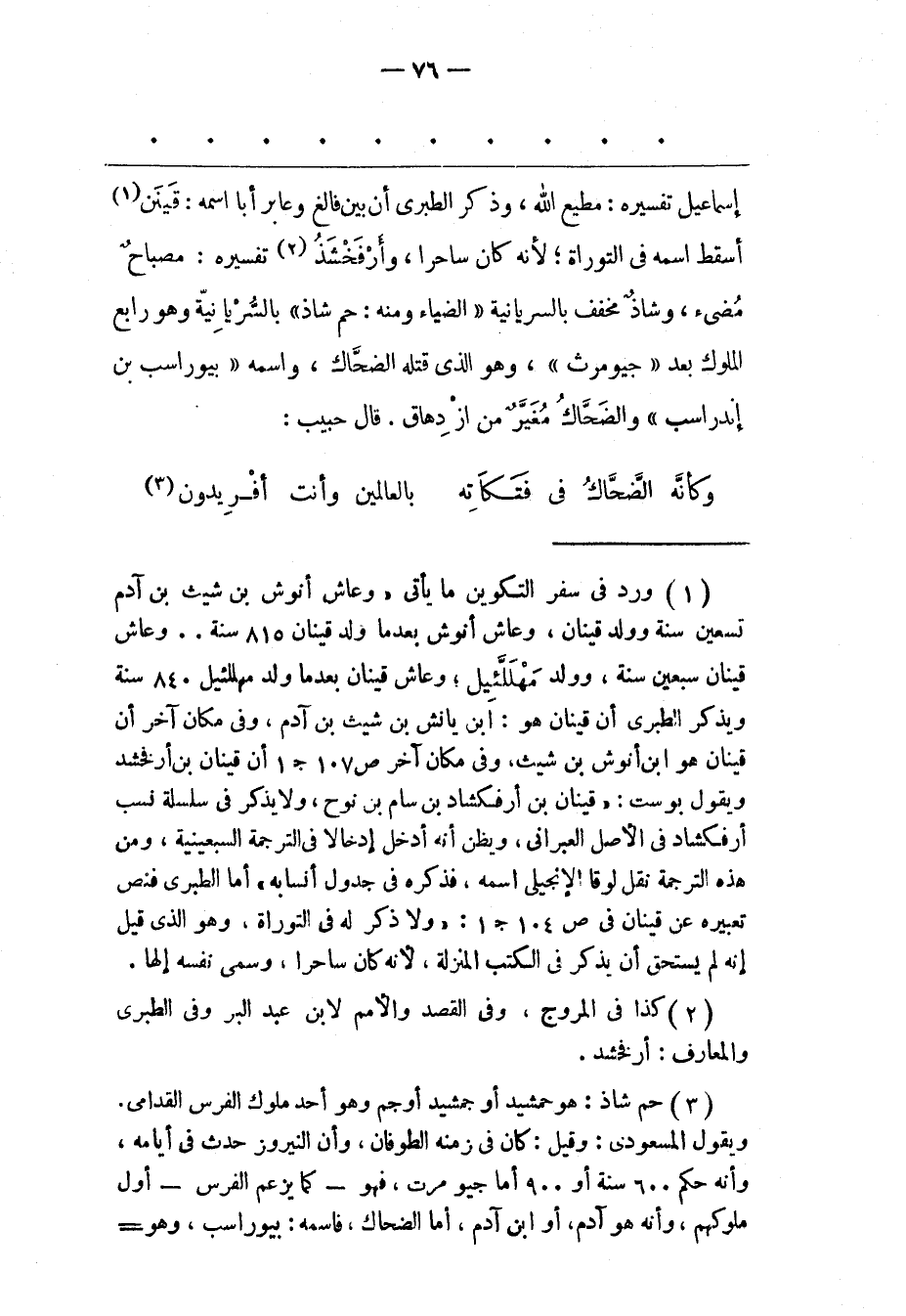 (1) ورد فى سفر التكوين ما يأتى «وعاش أنوش بن شيث بن آدم تسعين سنة وولد قينان، وعاش أنوش بعد ما ولد قينان 815 سنة.. وعاش قينان سبعين سنة، وولد مهللّئيل؛ وعاش قينان بعد ما ولد مهللئيل 840 سنة ويذكر الطبرى أن قينان هو: ابن يانش بن شيث بن آدم، وفى مكان آخر أن قينان هو ابن أنوش بن شيث، وفى مكان آخر ص 107 ج 1 أن قينان بن أرفخشد ويقول بوست: «قينان بن أرفكشاد بن سام بن نوح، ولا يذكر فى سلسلة نسب أرفكشاد فى الأصل العبرانى، ويظن أنه أدخل إدخالا فى الترجمة السبعينية، ومن هذه الترجمة نقل لوقا الإنجيلى اسمه، فذكره فى جدول أنسابه» أما الطبرى فنص تعبيره عن قينان فى ص 104 ج 1: «ولا ذكر له فى التوراة، وهو الذى قيل إنه لم يستحق أن يذكر فى الكتب المنزلة، لأنه كان ساحرا، وسمى نفسه إلها.