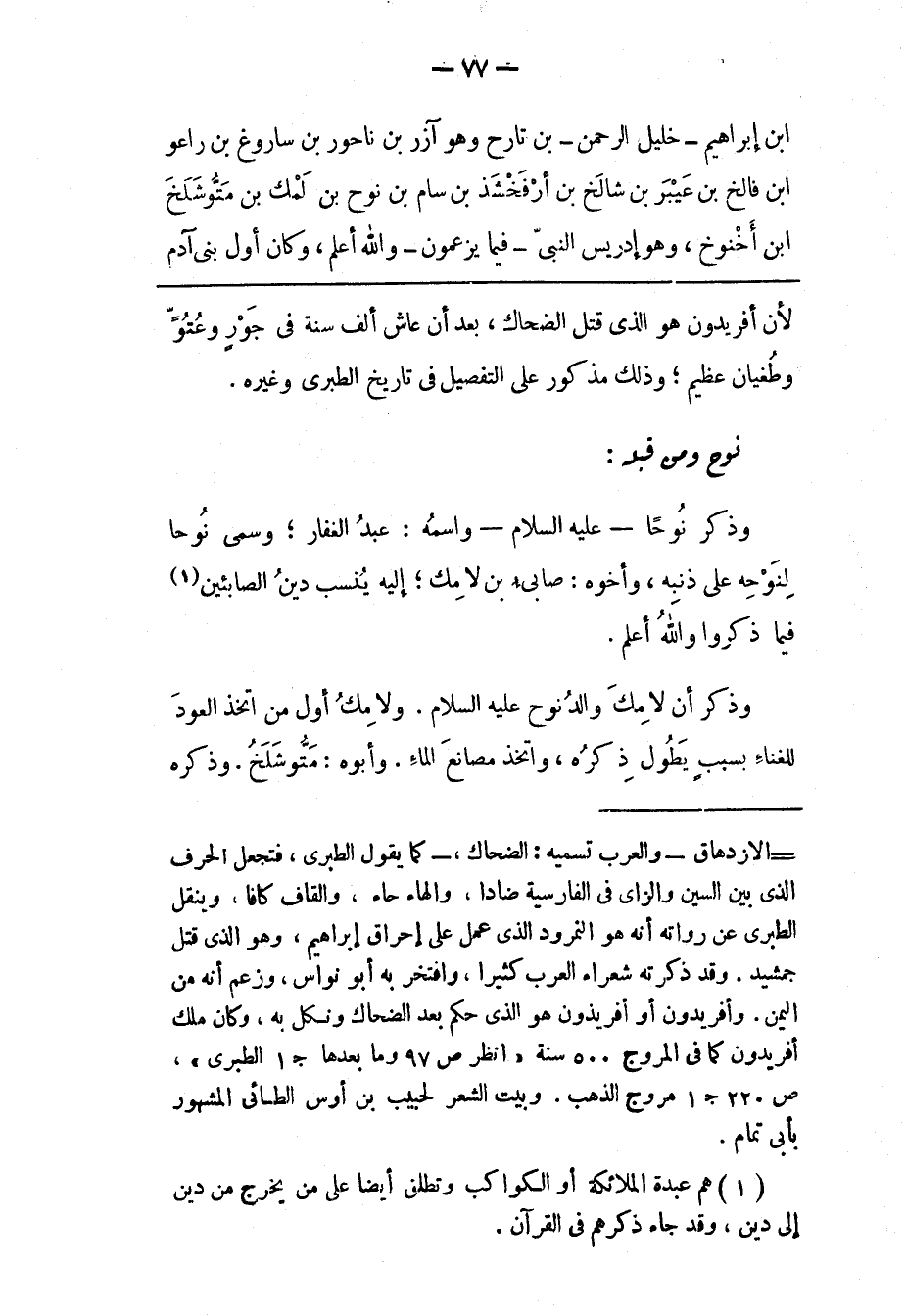 - الازدهاق- والعرب تسميه: الضحاك، - كما يقول الطبرى، فتجعل الحرف الذى بين السين والزاى فى الفارسية ضادا، والهاء حاء، والقاف كافا، وينقل الطبرى عن رواته أنه هو النمرود الذى عمل على إحراق إبراهيم، وهو الذى قتل جمشيد. وقد ذكرته شعراء العرب كثيرا، وافتخر به أبو نواس، وزعم أنه من اليمن. وأفريدون أو أفريذون هو الذى حكم بعد الضحاك ونكل به، وكان ملك أفريدون كما فى المروج 500 سنة «انظر ص 97 وما بعدها ج 1 الطبرى» ، ص 220 ج 1 مروج الذهب. وبيت الشعر لحبيب بن أوس الطائى المشهور بأبى تمام.