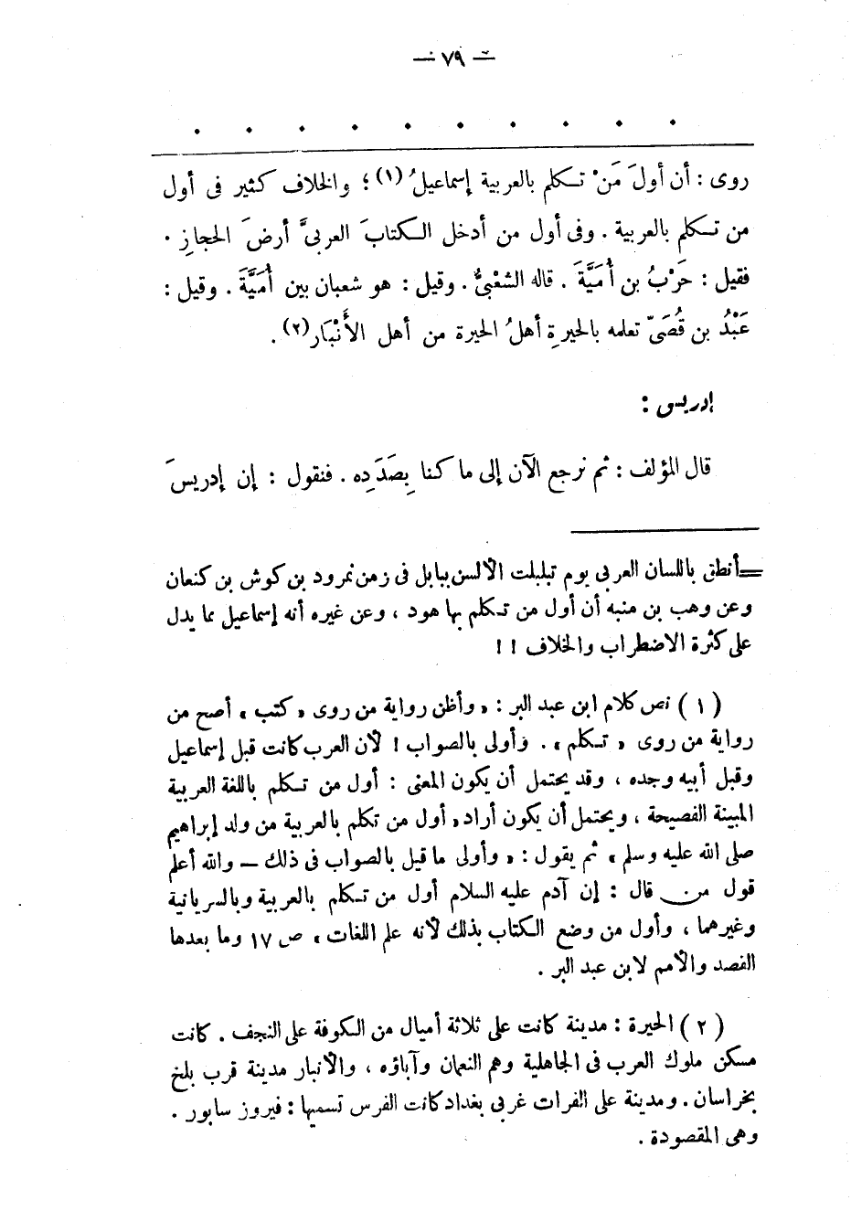 (1) نص كلام ابن عبد البر: «وأظن رواية من روى «كتب» أصح من رواية من روى «تكلم» . وأولى بالصواب! لأن العرب كانت قبل إسماعيل وقبل أبيه وجده، وقد يحتمل أن يكون المعنى: أول من تكلم باللغة العربية المبينة الفصيحة، ويحتمل أن يكون أراد «أول من تكلم بالعربية من ولد إبراهيم صلى الله عليه وسلم» ثم يقول: «وأولى ما قيل بالصواب فى ذلك- والله أعلم قول من قال: إن آدم عليه السلام أول من تكلم بالعربية وبالسريانية وغيرهما، وأول من وضع الكتاب بذلك لأنه علم اللغات» ص 17 وما بعدها القصد والأمم لابن عبد البر.