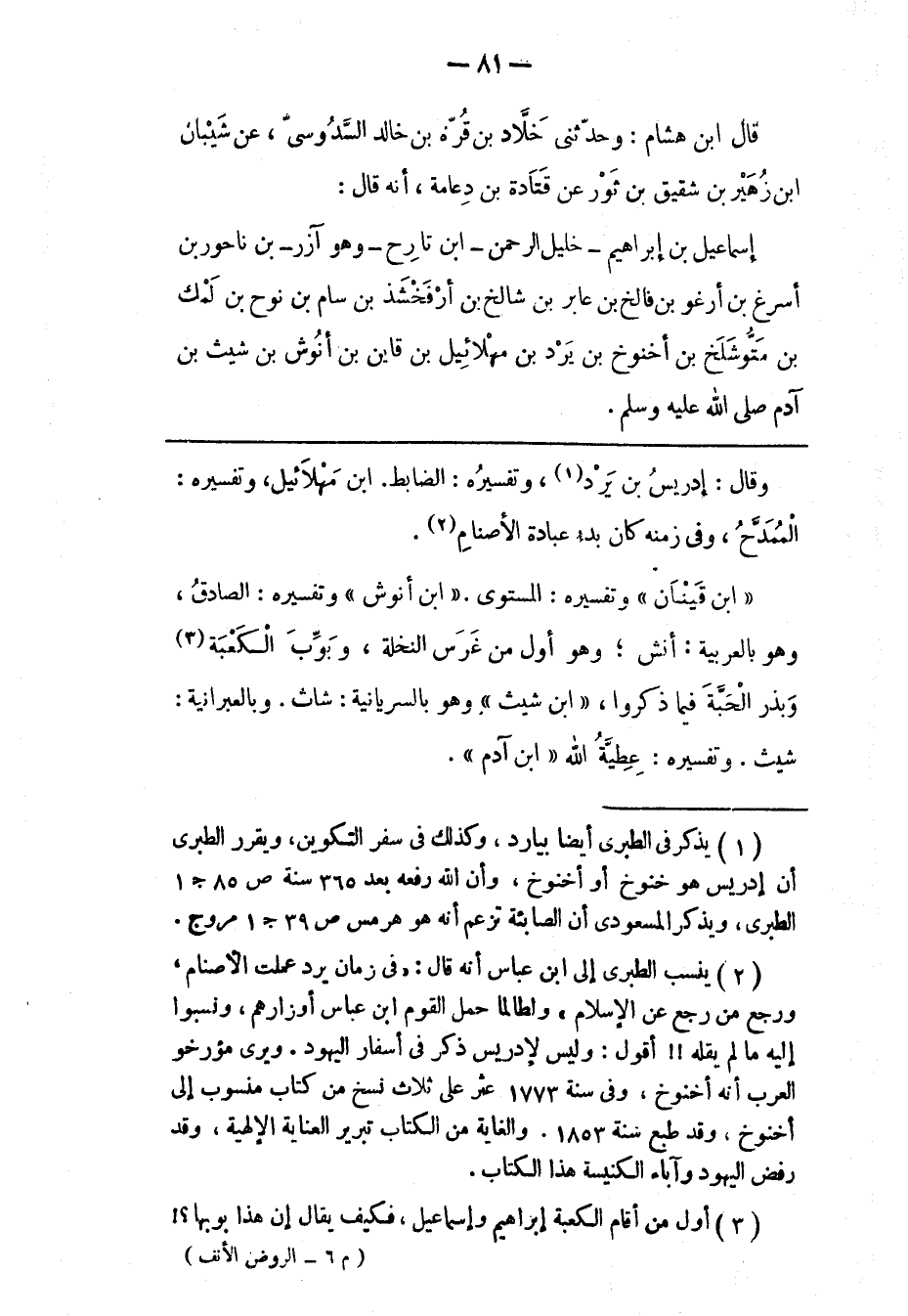 (2) ينسب الطبرى إلى ابن عباس أنه قال: «فى زمان يرد عملت الأصنام، ورجع من رجع عن الإسلام» ولطالما حمل القوم ابن عباس أوزارهم، ونسبوا إليه ما لم يقله!! أقول: وليس لإدريس ذكر فى أسفار اليهود. ويرى مؤرخو العرب أنه أخنوخ، وفى سنة 1773 عثر على ثلاث نسخ من كتاب منسوب إلى أخنوخ، وقد طبع سنة 1853. والغاية من الكتاب تبرير العناية الإلهية، وقد رفض اليهود وآباء الكنيسة هذا الكتاب.