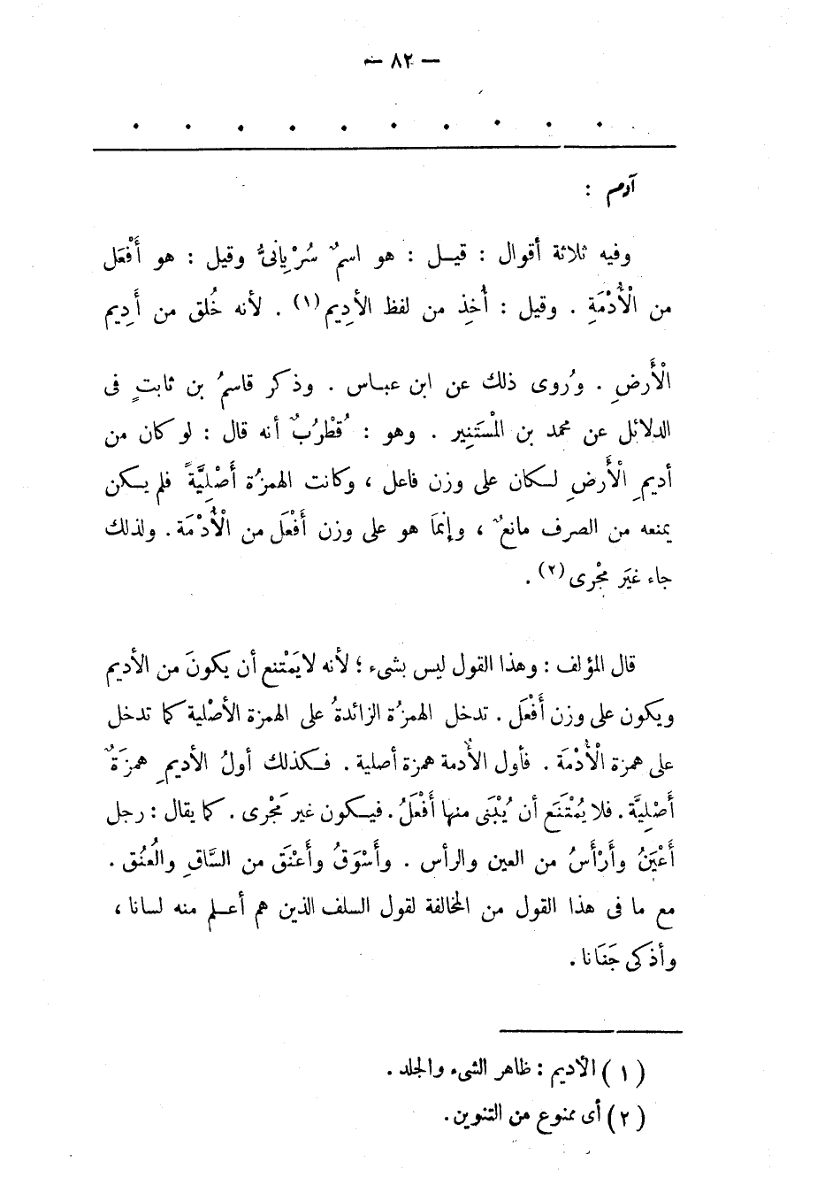 وَفِيهِ ثَلَاثَةُ أَقْوَالٍ: قِيلَ: هُوَ اسْمٌ سُرْيَانِيّ وَقِيلَ: هُوَ أَفْعَلُ مِنْ الْأُدْمَةِ. وَقِيلَ: أُخِذَ مِنْ لَفْظِ الْأَدِيمِ «1» . لِأَنّهُ خُلِقَ مِنْ أَدِيمِ الْأَرْضِ. وَرُوِيَ ذَلِكَ عَنْ ابْنِ عَبّاسٍ. وَذَكَرَ قَاسِمُ بْنُ ثَابِتٍ فِي الدّلَائِلِ عَنْ مُحَمّدِ بْنِ الْمُسْتَنِيرِ. وَهُوَ: قُطْرُبٌ أَنّهُ قَالَ: لَوْ كَانَ مِنْ أَدِيمِ الْأَرْضِ لَكَانَ عَلَى وَزْنِ فَاعِلٍ، وَكَانَتْ الْهَمْزَةُ أَصْلِيّةً فَلَمْ يَكُنْ يَمْنَعُهُ مِنْ الصّرْفِ مَانِعٌ، وَإِنّمَا هُوَ عَلَى وَزْنِ أَفْعَلَ مِنْ الْأُدْمَةِ. وَلِذَلِكَ جَاءَ غَيْرَ مجرى «2» .