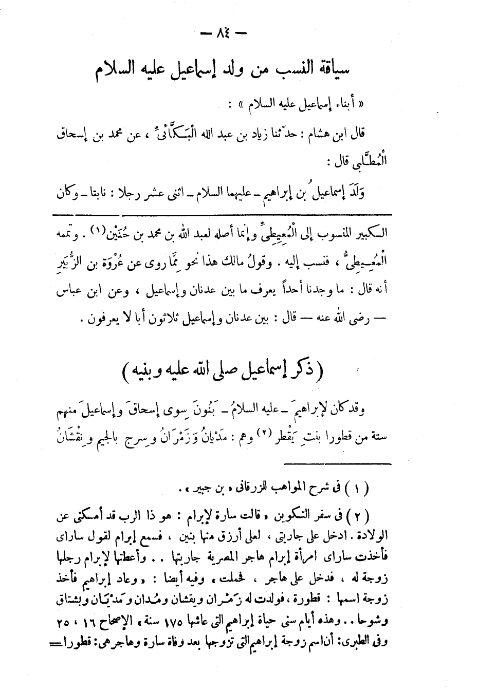 (ذِكْرُ إسْمَاعِيلَ صَلّى اللهُ عَلَيْهِ وَبَنِيهِ) وَقَدْ كَانَ لِإِبْرَاهِيمَ- عَلَيْهِ السّلَامُ- بَنُونَ سِوَى إسْحَاقَ وَإِسْمَاعِيلَ مِنْهُمْ سِتّةٌ مِنْ قَطُورَا بِنْتِ يَقْطُرَ «2» وَهُمْ: مَدْيَانُ وَزَمِرَانِ وَسُرُج بِالْجِيمِ وَنَقْشَانِ
