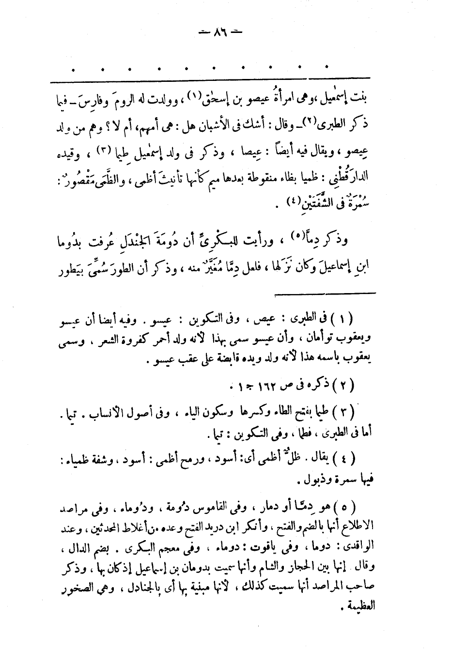 (5) هو دمّا أو دمار، وفى القاموس دومة، ودوماء، وفى مراصد الاطلاع أنها بالضم والفتح، وأنكر ابن دريد الفتح وعده من أغلاط المحدثين، وعند الواقدى: دوما، وفى ياقوت: دوماء، وفى معجم البكرى. بضم الدال، وقال إنها بين الحجاز والشام وأنها سميت بدومان بن إسماعيل إذ كان بها، وذكر صاحب المراصد أنها سميت كذلك، لأنها مبنية بها أى بالجنادل، وهى الصخور العظيمة.