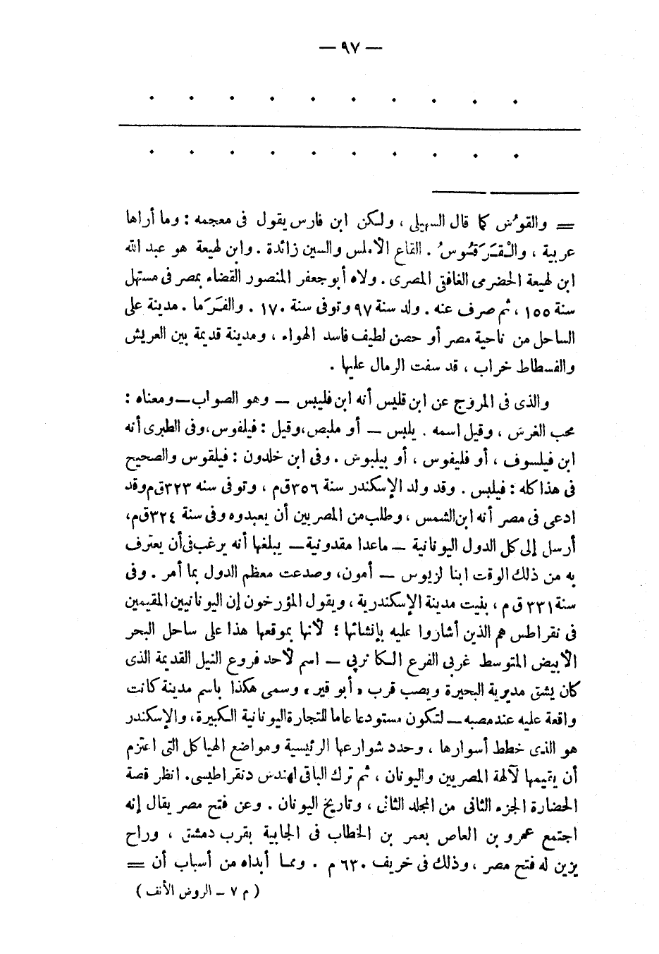 والقوس كما قال السهيلى، ولكن ابن فارس يقول فى معجمه: وما أراها عربية، والقرقوس. القاع الأملس والسين زائدة. وابن لهيعة هو عبد الله ابن لهيعة الحضرمى الغافقى المصرى. ولاه أبو جعفر المنصور القضاء بمصر فى مستهل سنة 155، ثم صرف عنه. ولد سنة 97 وتوفى سنة 170. والفرما. مدينة على الساحل من ناحية مصر أو حصن لطيف فاسد الهواء، ومدينة قديمة بين العريش والفسطاط خراب، قد سفت الرمال عليها. والذى فى المروج عن ابن قليس أنه ابن فليبس- وهو الصواب- ومعناه: محب الغرس، وقيل اسمه. يلبس- أو ملبص، وقيل: فيلفوس، وفى الطبرى أنه ابن فيلسوف، أو فليفوس، أو بيلبوس. وفى ابن خلدون: فليقوس والصحيح فى هذا كله: فيلبس. وقد ولد الإسكندر سنة 356 ق م، وتوفى سنه 323 ق م وقد ادعى فى مصر أنه ابن الشمس، وطلب من المصريين أن يعبدوه وفى سنة 324 ق م، أرسل إلى كل الدول اليونانية- ما عدا مقدونية- يبلغها أنه يرغب فى أن يعترف به من ذلك الوقت ابنا لزيوس- أمون، وصدعت معظم الدول بما أمر. وفى سنة 331 ق م، بنيت مدينة الإسكندرية، ويقول المؤرخون إن اليونانيين المقيمين فى نقراطس هم الذين أشاروا عليه بإنشائها؛ لأنها بموقعها هذا على ساحل البحر الأبيض المتوسط غربى الفرع الكانرپى- اسم لأحد فروع النيل القديمة الذى كان يشق مديرية البحيرة ويصب قرب «أبو قير» وسمى هكذا باسم مدينة كانت واقعة عليه عند مصبه- لتكون مستودعا عاما للتجارة اليونانية الكبيرة، والإسكندر هو الذى خطط أسوارها، وحدد شوارعها الرئيسية ومواضع الهيا كل التى اعتزم أن يقيمها لآلهة المصريين واليونان، ثم ترك الباقى لمهندس دنقراطيسى. انظر قصة الحضارة الجزء الثانى من المجلد الثانى، وتاريخ اليونان. وعن فتح مصر يقال إنه اجتمع عمرو بن العاص بعمر بن الخطاب فى الجابية بقرب دمشق، وراح يزين له فتح مصر، وذلك فى خريف 630 م. ومما أبداه من أسباب أن-