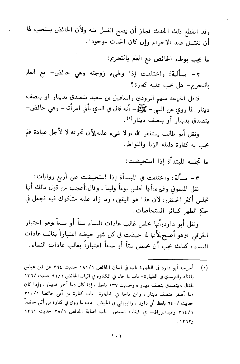 ٢ - مسألة: واختلفت إذا وطىء زوجته وهي حائض ـ مع العلم بالتحريم ـ هل يجب عليه كفارة؟