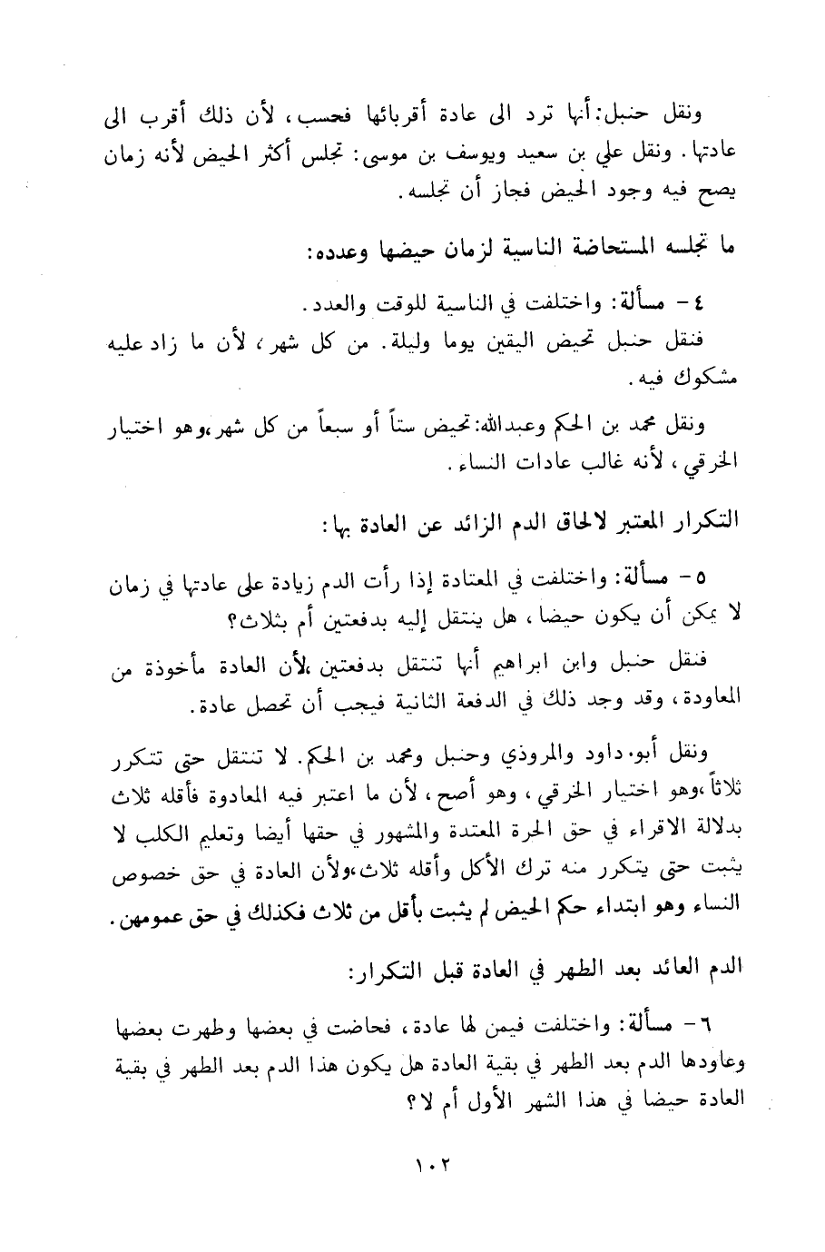٦ - مسألة: واختلفت فيمن لها عادة، فحاضت في بعضها وطهرت بعضها وعاودها الدم بعد الطهر في بقية العادة هل يكون هذا الدم بعد الطهر في بقية العادة حيضاً في هذا الشهر الأول أم لا؟