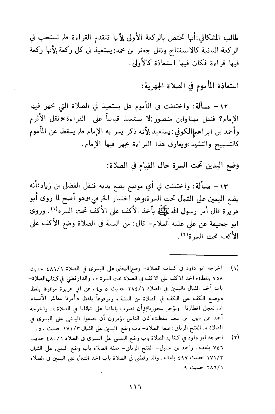 ١٣ - مسألة: واختلفت في أي موضع يضع يديه فنقل الفضل بن زياد: أنه يضع اليمين على الشمال تحت السرة، وهو اختيار الخرقي، وهو أصح لما روى أبو هريرة قال أمر رسول الله بأخذ الأكف على الأكف تحت السرة. وروى أبو جحيفة عن علي عليه السلام ـ قال: من السنة في الصلاة وضع الأكف على الأكف تحت السرة.