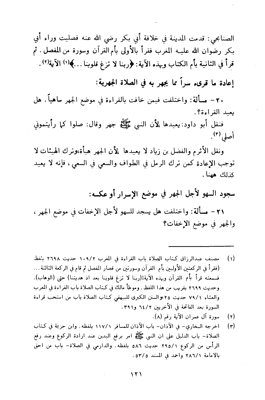٢٠ - مسألة: واختلفت فيمن خافت بالقراءة في موضع الجهر ساهياً. هل يعيد القراءة؟