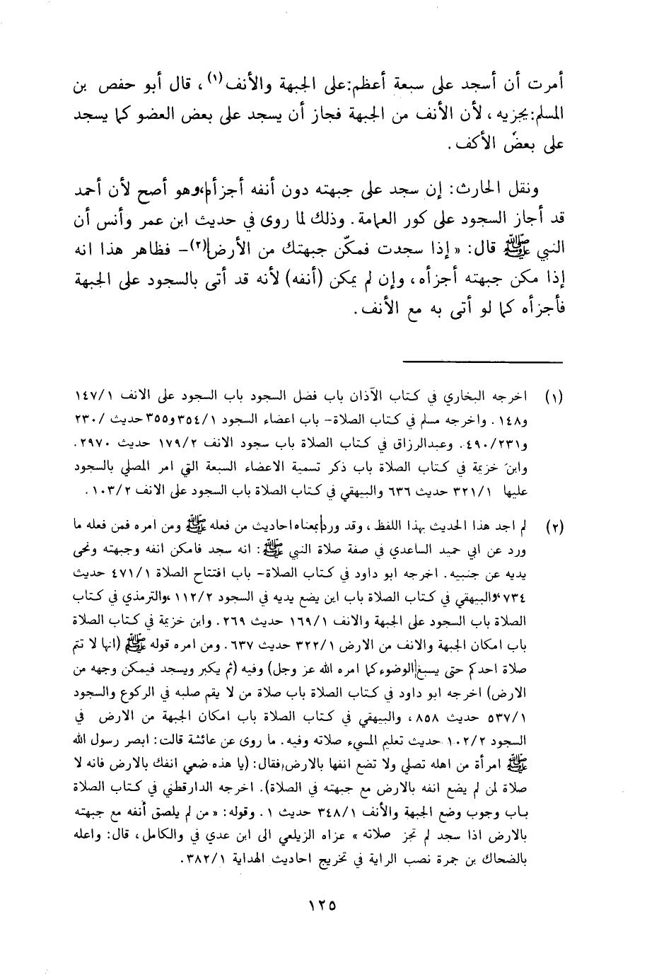 ونقل الحارث: إن سجد على جبهته دون أنفه أجزأه، وهو أصح لأن أحمد قد أجاز السجود على كور العمامة. وذلك لما روى في حديث ابن عمر وأنس أن النبي قال: إذا سجدت فمكَّن جبهتك من الأرض ـ فظاهر هذا أنه إذا مكن جبهته أجزأه، وإن لم يكن (أنفه) لأنه قد أتى بالسجود على الجبهة فأجزأه كما لو أتى به مع الأنف.