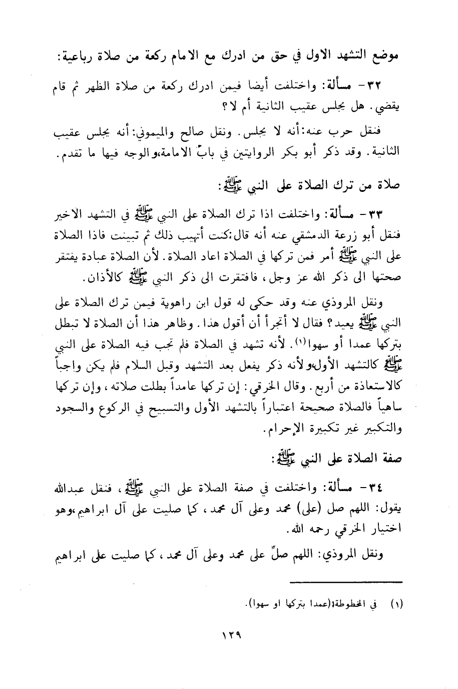 ٣٤ - مسألة: واختلفت في صفة الصلاة على النبي، فنقل عبد الله يقول: اللهم صل (على) محمد وعلى آل محمد، كما صليت على آل إبراهيم، وهو اختيار الخرقي رحمه الله.