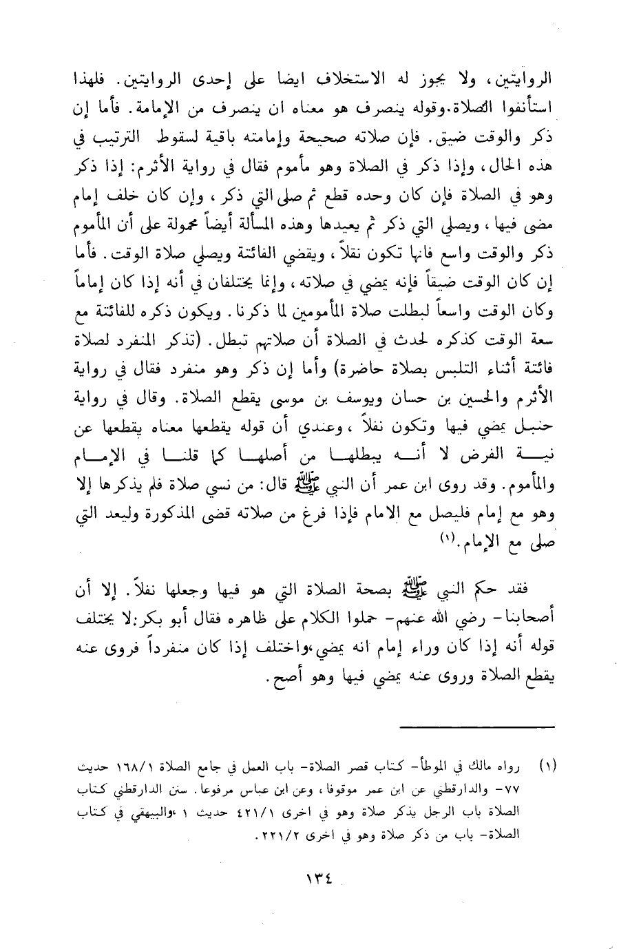 (تذكر المنفرد لصلاة فائتة أثناء التلبس بصلاة حاضرة) وأما إن ذكر وهو منفرد فقال في رواية الأثرم والحسين بن حسان ويوسف بن موسى يقطع الصلاة. وقال في رواية حنبل يمضي فيها وتكون نقلاً. وعندي أن قوله يقطعها معناه يقطعها عن نية الفرض لا أنه يبطلها من أصلها كما قلنا في الإمام والمأموم. وقد روى ابن عمر أن النبي قال: من نسي صلاة فلم يذكرها إلا وهو مع إمام فليصل مع الإمام فإذا فرغ من صلاته قضى المذكورة وليعد التي صلى مع الإمام.