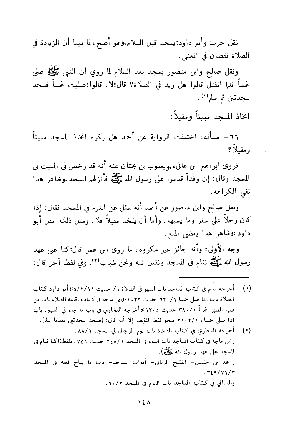 ٦٦ - مسألة: واختلفت الرواية عن أحمد هل يكره اتخاذ المسجد مبيتاً ومقيلاً؟