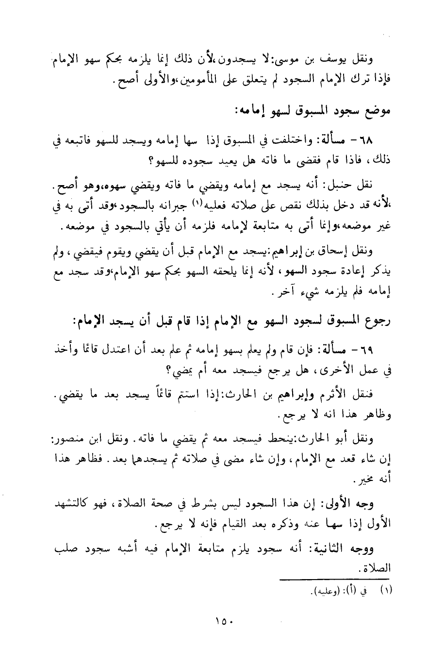 ٦٨ - مسألة: واختلفت في المسبوق إذا سها إمامه ويسجد للسهو فاتبعه في ذلك، فإذا قام فقضى ما فاته هل يعيد سجوده للسهو؟