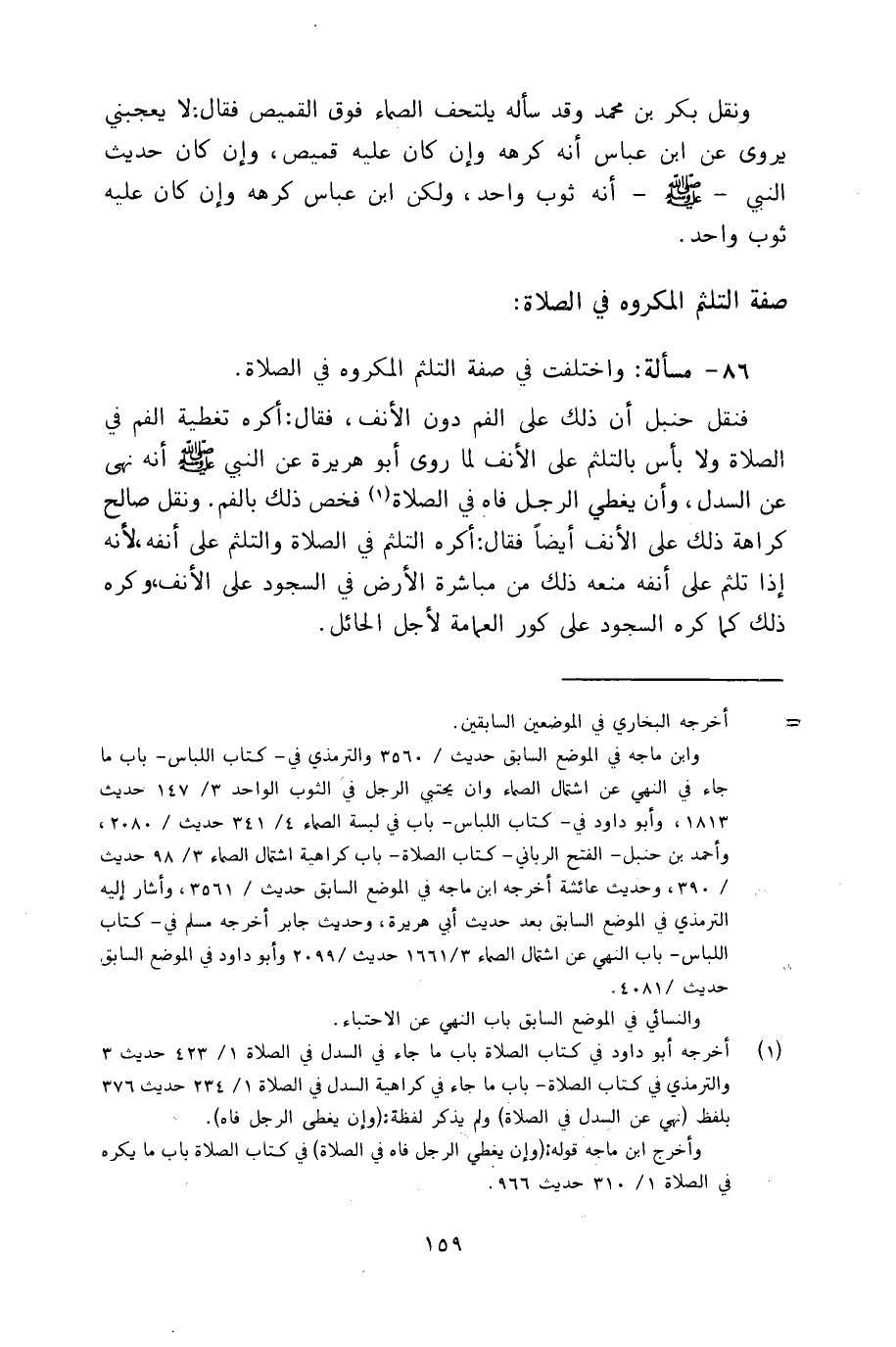 ٨٦ - مسألة واختلفت في صفة التلثم المكروه في الصلاة فنق لحنبل أن ذلك على الفم دون الأنف فقال: أكره تغطية الفم في الصلاة ولا بأس بالتلثم على الأنف لما روى أبو هريرة عن النبي أنه نهى عن السدل، وأن يغطي الرجل فاه في الصلاة فخص ذلك بالفم. ونقل صالح كراهة ذلك على الأنف أيضاً فقال: أكره التلثم في الصلاة والتلثم على أنفه، لأنه إذا تلثم على أنفه منعه ذلك من مباشرة الأرض في السجود على الأنف، وكره ذلك كما كره السجود على كور العمامة لأجل الحائل.