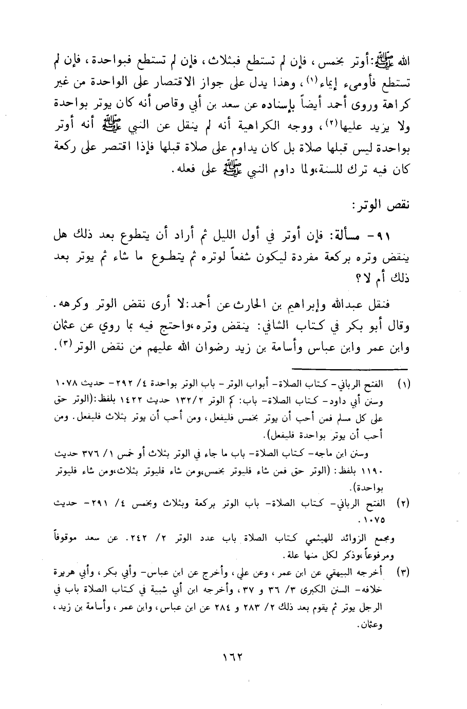 ٩١ - مسألة: فإن أوتر في الليل ثم أراد أن يتطوع بعد ذلك هل ينقض وتره بركعة مفردة ليكون شفعاً لوتره ثم يتطوع ما شاء ثم يوتر بعد ذلك أم لا؟