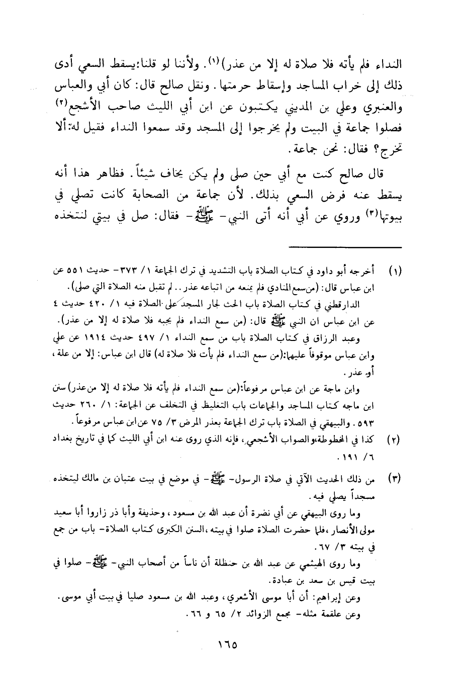 النداء فلم يأته فلا صلاة له إلا من عذر). ولأننا لو قلنا: يسقط السعي أدى ذلك إلى خراب المساجد وإسقاط حرمتها. ونقل صالح قال: كان أبي والعباس والعنبري وعلي بن المديني يكتبون عن ابن أبي الليث صاحب الأشجع فصلوا جماعة في البيت ولم يخرجوا إلى المسجد وقد سمعوا النداء فقيل له: ألا تخرج؟ فقال: نحن جماعة.