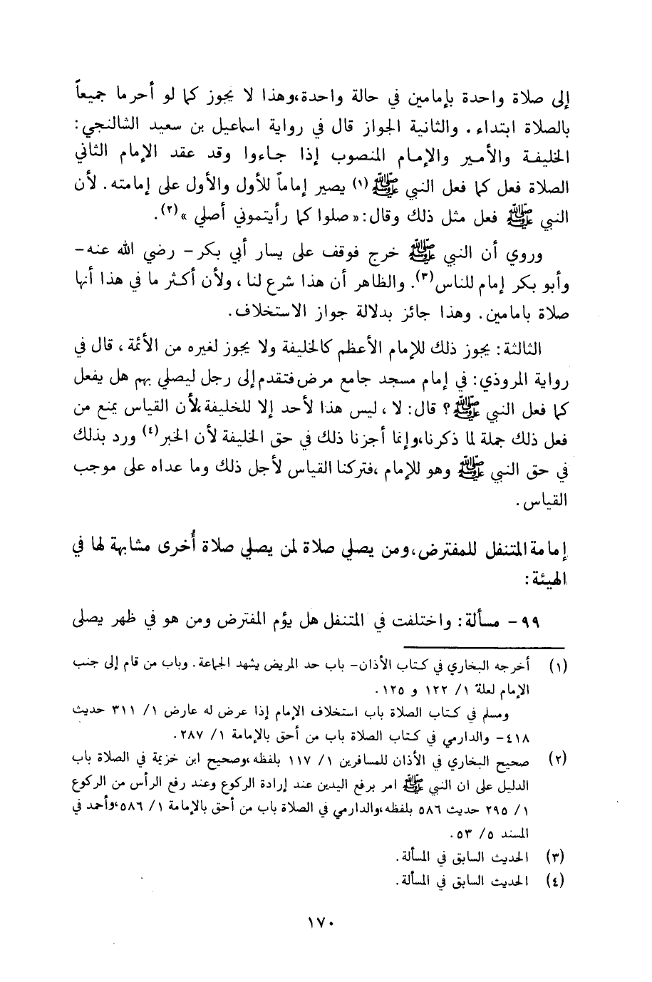 ٩٩ - مسألة: واختلفت في المتنفل هل يؤم المفترض ومن هو في ظهر يصلى