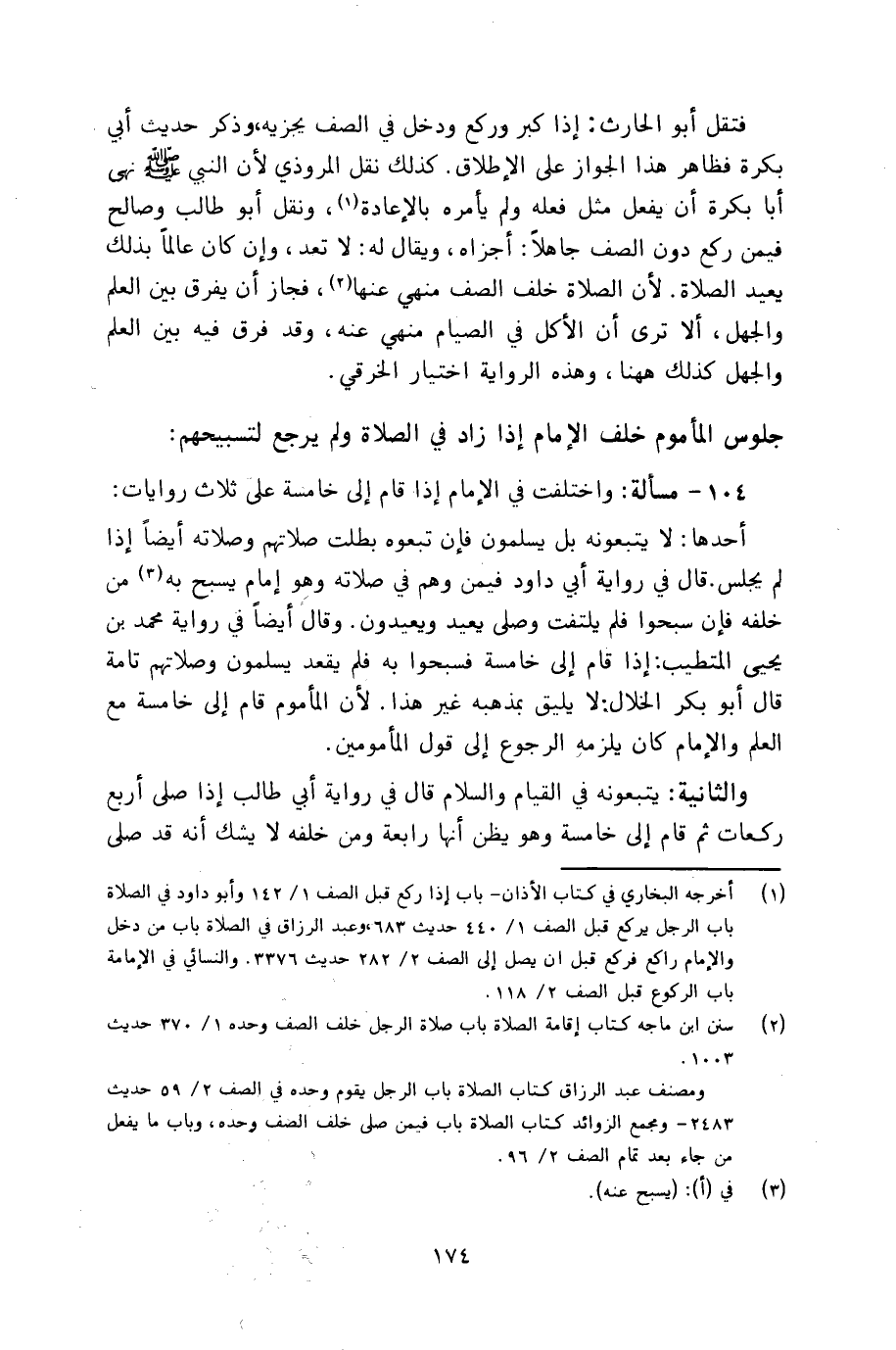 ١٠٤ - مسألة: واختلفت في الإمام إذا قام إلى خامسة على ثلاث روايات: