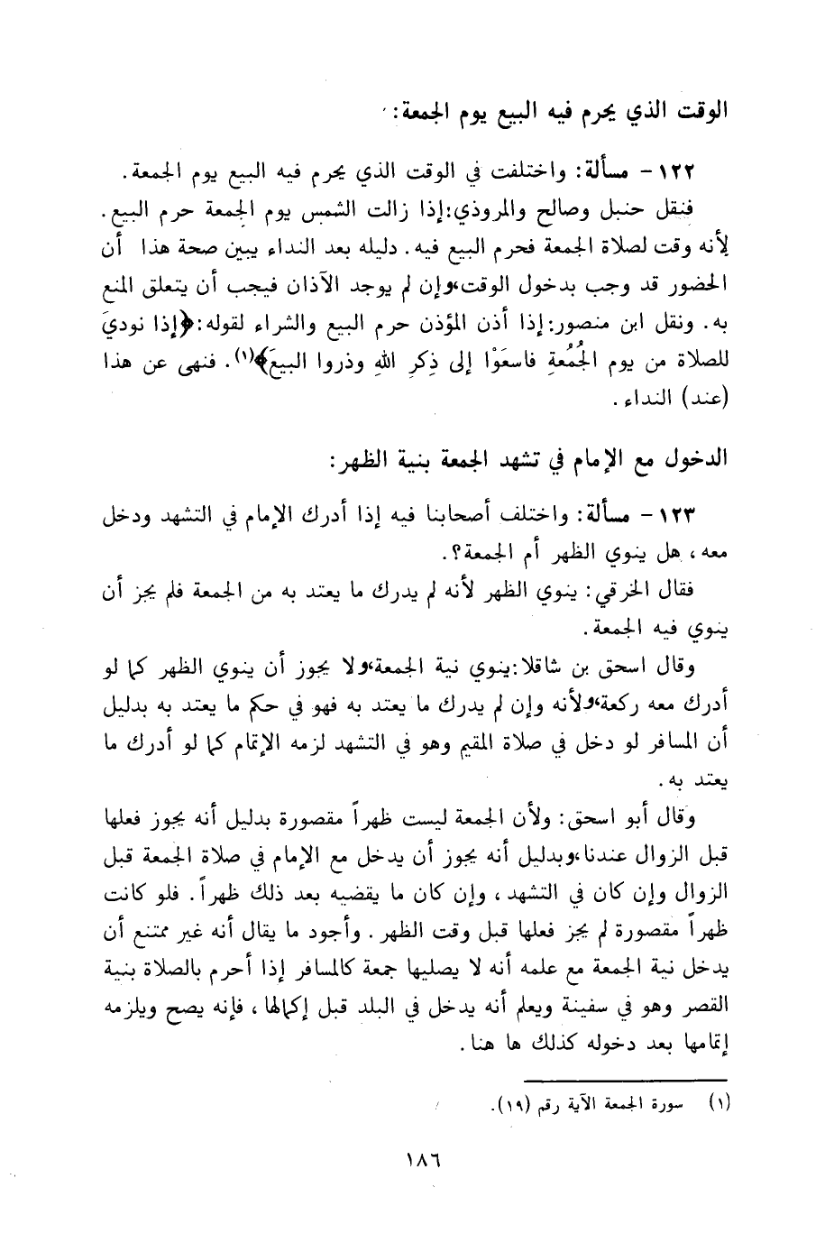 وقل أبو إسحاق: ولأن الجمعة ليست ظهراً مقصورة بدليل أنه يجوز فعلها قبل الزوال عندنا، وبدليل أنه يجوز أن يدخل مع الإمام في صلاة الجمعة قبل الزوال وإن كان في التشهد، وإن كان ما يقضيه بعد ذلك ظهراً. فلو كانت ظهراً مقصورة لم يجز فعلها قبل وقت الظهر. وأجود ما يقال أنه غير ممتنع أن يدخل نية الجمعة مع علمه أنه لا يصليها جمعة كالمسافر إذا أحرم بالصلاة بنية القصر وهو في سفينة ويعلم أنه يدخل في البلد قبل إكمالها، فإنه يصح ويلزمه إتمامها بعد دخوله كذلك هاهنا.