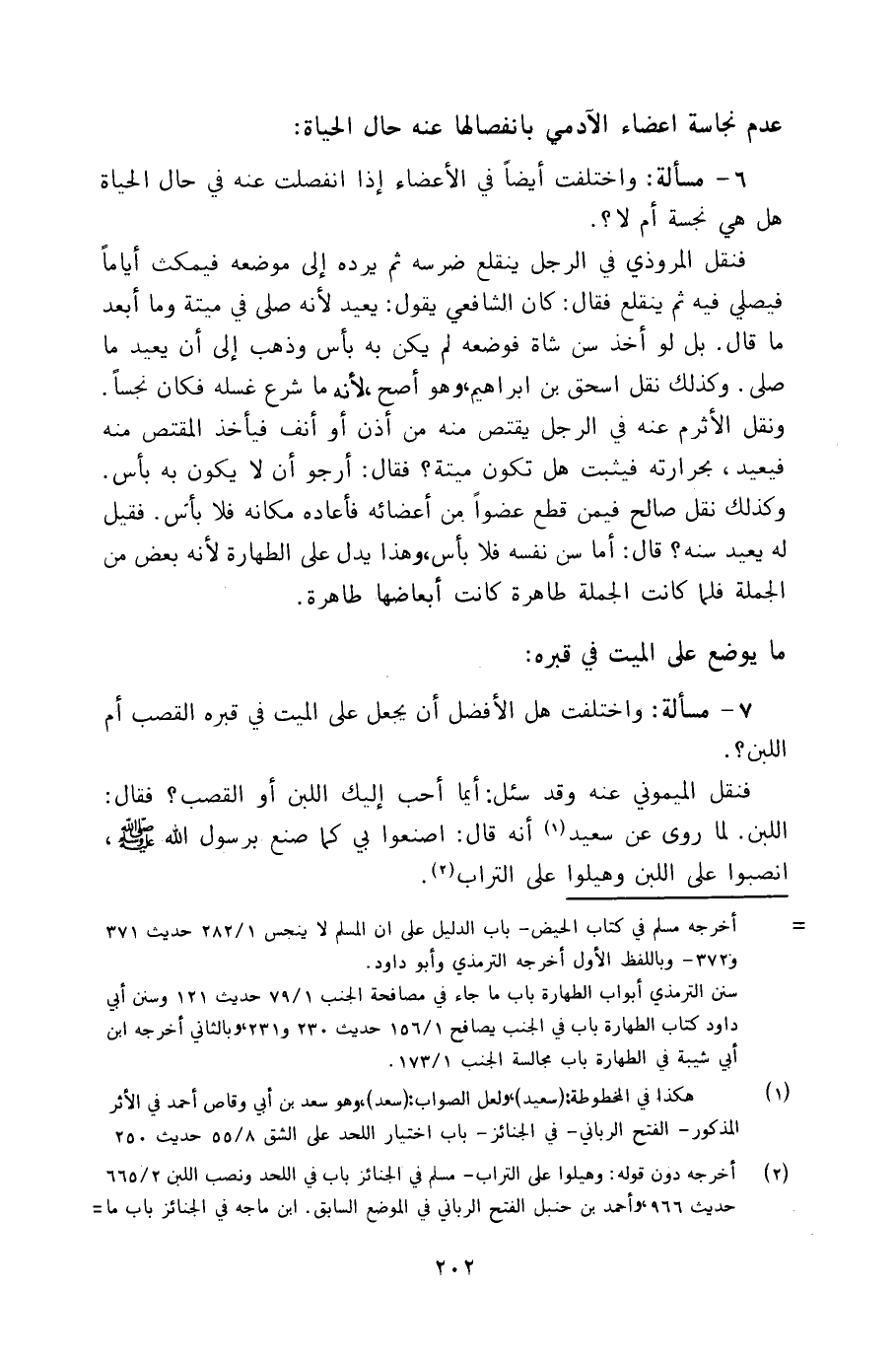 ٦ - مسألة: واختلفت أيضاً في الأعضاء إذا انفصلت عنه في حال الحياة هل هي نجسة أم لا؟