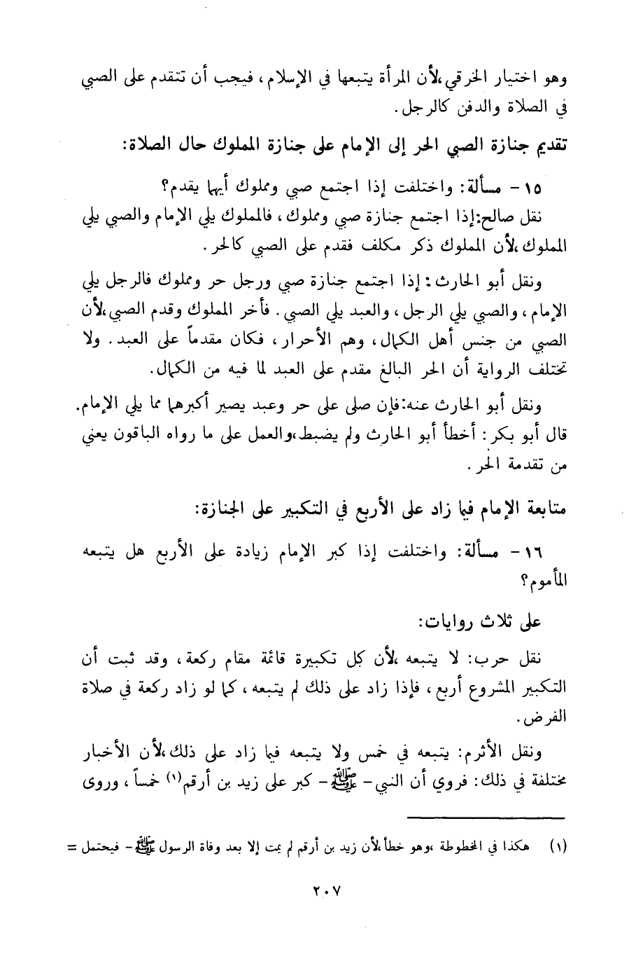 ونقل أبو الحارث: إدا اجتمع جنازة صبي ورجل حر ومملوك فالرجل يلي الإمام، والصبي يلي الرجل، والعبد يلي الصبي. فأخر المملوك وقدم الصبي، لأن الصبي من جنس أهل الكمال، وهم الأحرار، فكان مقدماً على العبد. ولا تختلف الرواية أن الحر البالغ مقدم على العبد لما فيه من الكمال.