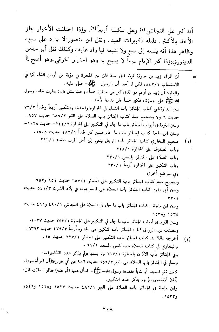 أنه كبر على النجاشي وعلى سكينة أربعاً. وإذا اختلفت الأخبار جاز الأخذ بالأكثر. دليله تكبيرات العيد. ونقل ابن منصور: لا يزاد على سبع، وظاهر هذا أنه يتبعه إلى سبع ولا يتبعه فيما زاد عليه، وكذلك نقل أبو حفص الدينوري: إذا كبر الإمام سبعاً لا يسبح به وهو اختيار الخرقي، وهو أصح لما