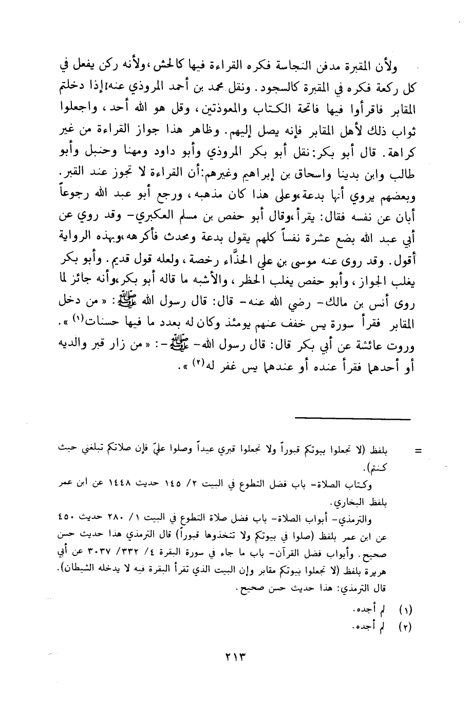 ولأن المقبرة مدفن النجاسة فكره القراءة فيها كالحش، ولأنه ركن يفعل في كل ركعة فكره في المقبرة كالسجود. ونقل محمد بن أحمد المروذي عنه: إذا دخلتم المقابر فاقرأوا فيها فاتحة الكتاب والمعوذتين، وقل هو الله أحد، واجعلوا ثواب ذلك لأهل المقابر فإنه يصل إليهم. وظاهر هذا جواز القراءة من غير كراهة. قال أبو بكر: نقل أبو بكر المروذي وأبو داواد ومهنا وحنبل وأبو طالب وابن بدينا وإسحاق بن إبراهيم وغيرهم: أن القراءة لا تجوز عند القبر. وبعضهم يروي أنها بدعة، وعلى هذا كان مذهبه، ورجع أبو عبد الله رجوعاً أبان عن نفسه فقال: يقرأ، وقال أبو حفص بن مسلم العكبري ـ وقد روي عن أبي عبد الله بضع عشرة نفساً كلهم يقول بدعة ومحدث فأكرهه، وبهذه الرواية أقول: وقد روى عنه موسى بن علي الحذَّاء رخصة، ولعله قول قديم. وأبو بكر يغلب الجواز، وأبو حفص يغلب الحظر، والأشبه ما قاله أبو بكر، وأنه جائز لما روى أنس بن مالك ـ رضي الله عنه ـ قال: قال رسول الله: من دخل المقابر فقرأ سورة يس خفف عنهم يومئذ وكان له بعدد ما فيها حسنات. وروت عائشة عن أبي بكر قال: قال رسول الله ـ صلى الله عليه وسلم: من زار قبر والديه أو أحدهما فقرأ عنده أو عندهما يس غفر له.