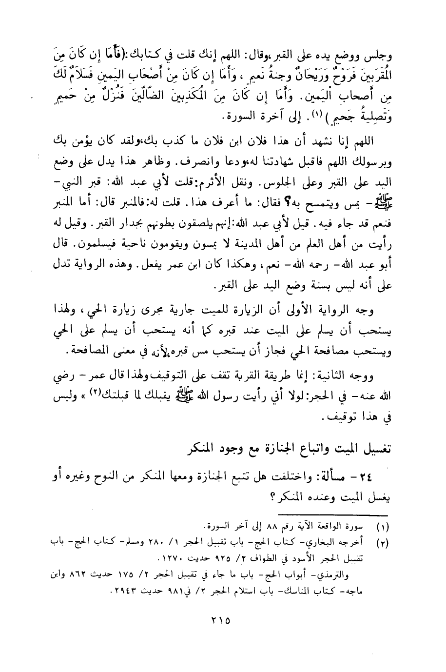 اللهم إنا نشهد أن هذا فلان ابن فلان ما كذب بك، ولقد كان يؤمن بك وبرسولك اللهم فاقبل شهادتنا له، ودعا وانصرف. وظاهر هذا يدل على وضع اليد على القبر وعلى الجلوس. ونقل الأثرم: قلت لأبي عبد الله: قبر النبي ـ صلى الله عليه وسلم يمس ويتمسح به؟ فقال: ما أعرف هذا. قلت له: فالمنبر قال: أما المنبر فنعم قد جاء فيه. قيل لأبي عبد الله: إنهم يلصقون بطونهم بجدار القبر. وقيل له رأيت من أهل العلم من أهل المدينة لا يمسون ويقومون ناحية فيسلمون. قال أبو عبد الله ـ رحمه الله ـ نعم، وهكذا كان ابن عمر يفعل. وهذه الرواية تدل على أنه ليس بسنة وضع اليد على القبر.