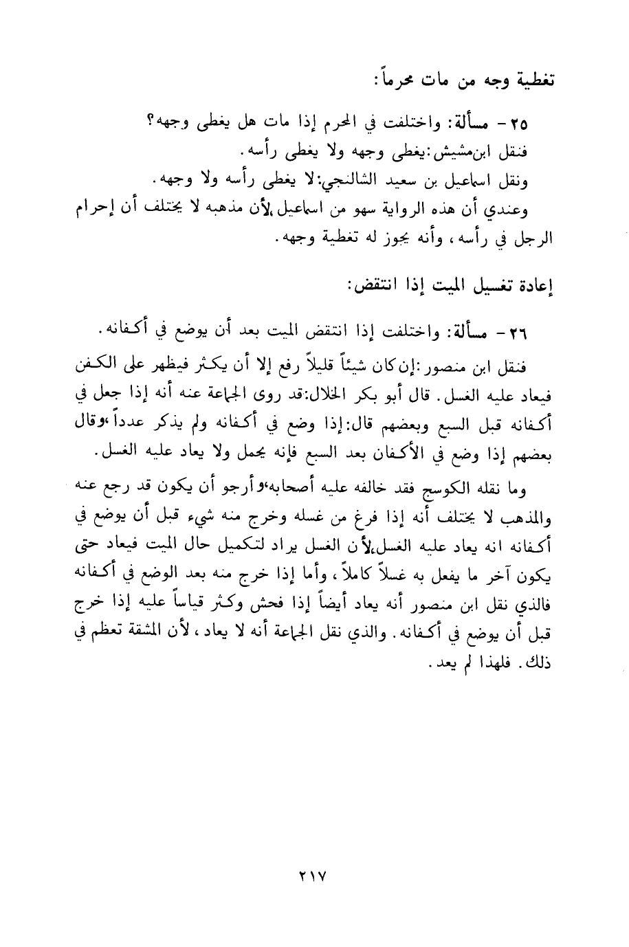 وما نقله الكوسج فقد خالفه عليه أصحابه، وأرجو أن يكون قد رجع عنه والمذهب لا يختلف أنه إذا فرغ من غسله وخرج منه شيء قبل أن يوضع في أكفانه لا أنه يعاد عليه الغسل، لأن الغسل يراد لتكميل حال الميت فيعاد حتى يكون آخر ما يفعل به غسلاً كاملاً، وأما إذا اخرج منه بعد الوضع في أكفانه فالذي نقل ابن منصور أنه يعاد أيضاً إذا فحش وكثر قياساً عليه إذا خرج قبل أن يوضع في أكفانه. والذي نقل الجماعة أنه لا يعاد، لأن المشقة تعظم في ذلك. فلهذا لم يعد.