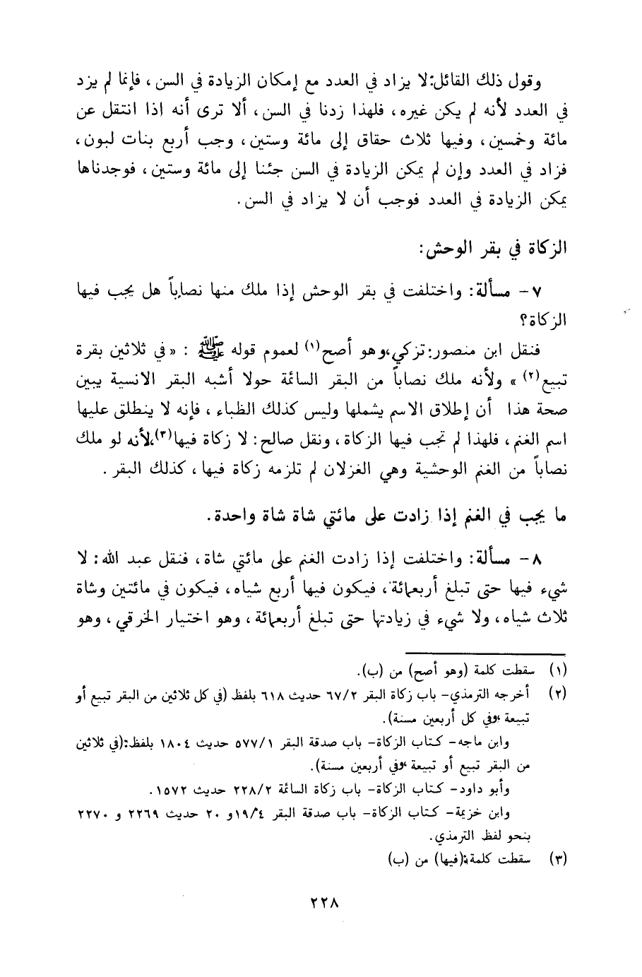 ٨ - مسألة: واختلفت إذا زادت الغنم على مائتي شاة، فنقل عبد الله: لا شيء فيها حتى تبلغ أربعمائة، فيكون فيها أربع شياه، فيكون في مائتين وشاة ثلاث شياه، ولا شيء في زيادتها حتى تبلغ أربعمائة، وهو اختيار الخرقي، وهو