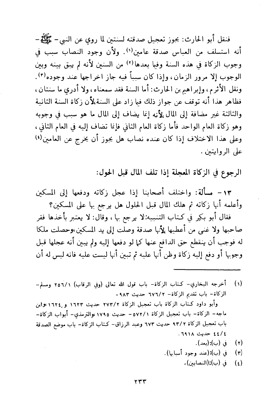 فنقل أبو الحارث: يجوز تعجيل صدقته لسنتين لما روي عن النبي ـ صلى الله عليه وسلم أنه استسلف من العباس صدقة عامين. ولأن وجود النصاب سبب في وجوب الزكاة في هذه السنة وفيما بعدها من السنين لأنه لم يبق بينه وبين الوجود إلا مرور الزمان، وإذا كان سبباً فيه جاز إخراجها عند وجوده. ونقل الأثرم، وإبراهيم بن الحارث: أما السنة فقد سمعناه، ولا أدري ما سنتان، فظاهر هذا أنه توقف عن جواز ذلك فيما زاد على السنة، لأن زكاة السنة الثانية والثالثة غير مضافة إلى المال، لأنه إنما يضاف إلى المال ما هو سبب في وجوبه وهو زكاة العام الواحد فأما زكاة العام الثاني فإنما تضاف إليه في العام الثاني، وعلى هذا الاختلاف إذا كان عنده نصاب هل يجوز أن يخرج عن العامين على الروايتين.