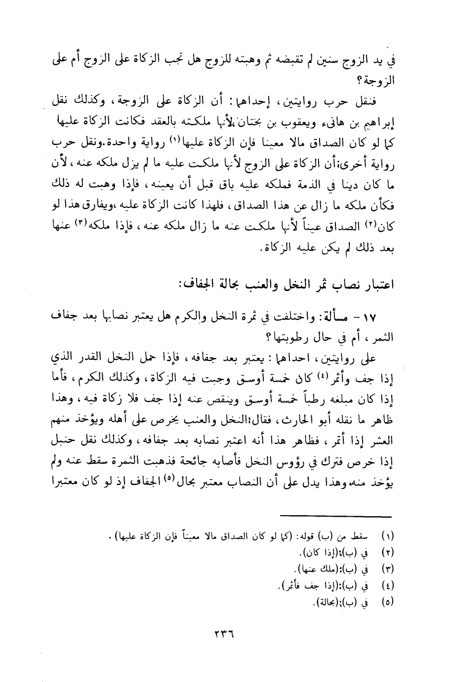 ١٧ - مسألة: واختلفت في ثمرة النخل والكرم هل يعتبر نصابها بعد جفاف الثمر، أم في حال رطوبتها؟