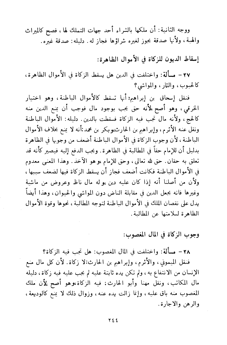 ٢٧ - مسألة: واختلفت في الدين هل يسقط الزكاة في الأموال الظاهرة، كالحبوب، والثمار، والمواشي؟