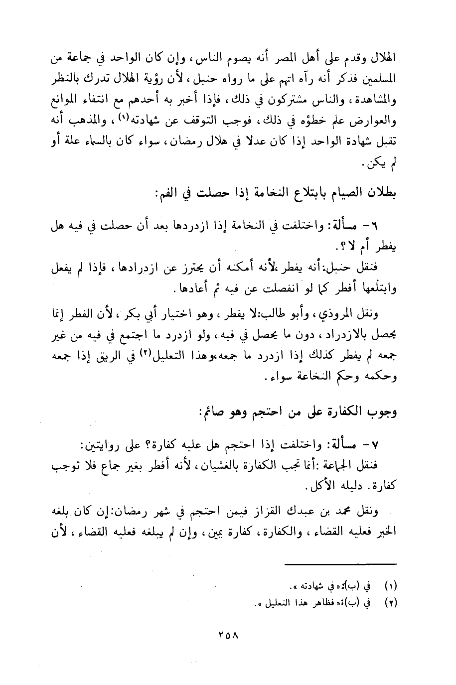 الهلال وقدم على أهل المصر أنه يصوم الناس، وإن كان الواحد في جماعة من المسلمين فذكر أنه رآه اتهم علم ما رواه حنبل، لأن رؤية الهلال تدرك بالنظر والمشاهدة، والناس مشتركون في ذلك، فإذا أخبر به أحدهم مع انتفاء الموانع والعوارض على خطؤه في ذلك، فوجب التوقف عن شهادته، والمذهب أنه تقبل شهادة الواحد إذا كان عدلاً في هلال رمضان، سواء كان بالسماء علة أو لم يكن.